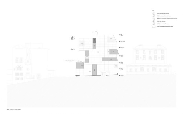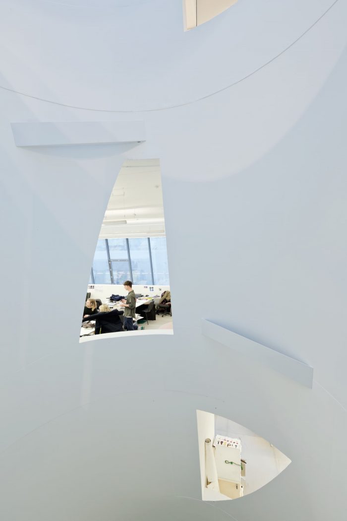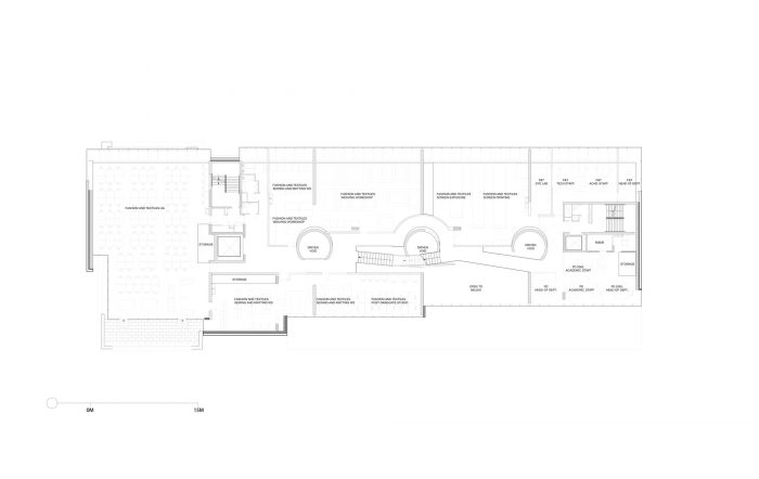 沿着南立面,在与麦金托什主工作室相同的高度,一个马凯尔形式的景观阳台给了学校一个向城市开放的外部社会核心。自然植被与一些石头工程将水引入一个小的循环水塘,将斑驳的阳光反射到里面的天花板上。贯穿新里德楼的 "连接回路 "鼓励各部门之间的 “创造性磨合",这是学校工作的核心。由阶梯式坡道组成的开放回路连接了所有主要空间--大厅、展览空间、项目空间、演讲厅、研讨室、工作室、工作坊,以及用于非正式聚会和展览的绿色平台。