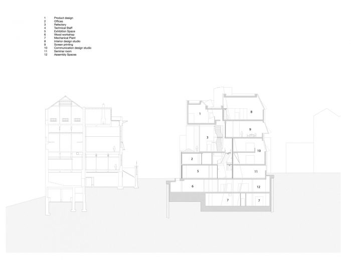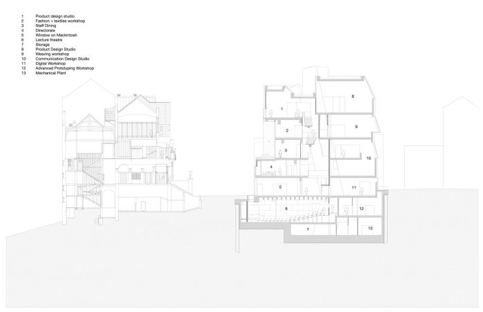 Mackintosh’s amazing manipulation of the building section for light in inventive ways has inspired the approach towards a plan of volumes in a different light. The studio/workshop is the basic building block of the building. Spaces have been located not only to reflect their interdependent relationships but also their varying needs for natural light. Studios are positioned on the north façade with large inclined north-facing glazing to maximize access to the desirable high-quality diffuse north light. Spaces that do not have a requirement for the same quality of natural light, such as the refectory and offices, are located on the South façade where access to sunlight can be balanced with the occupants' needs and the thermal performance of the space through the application of shading.