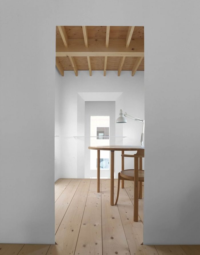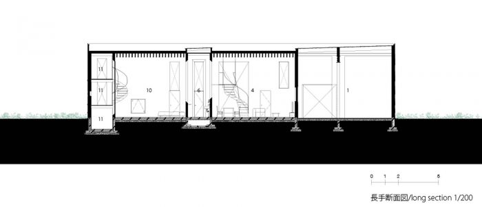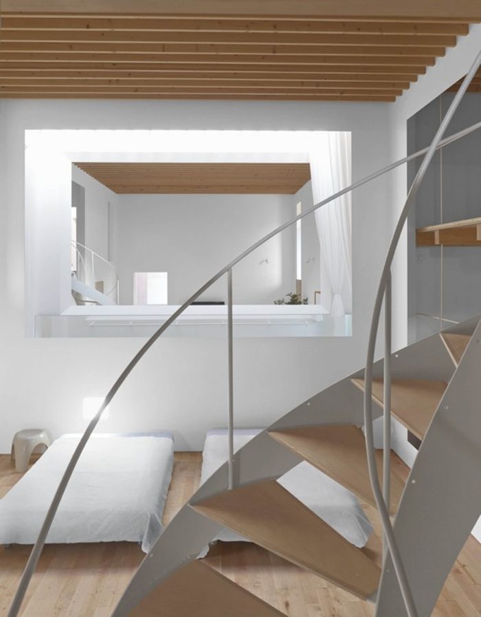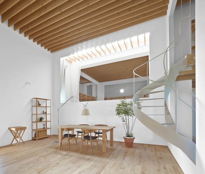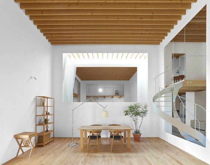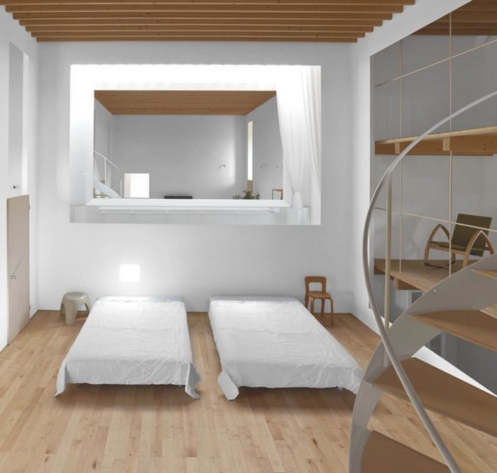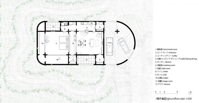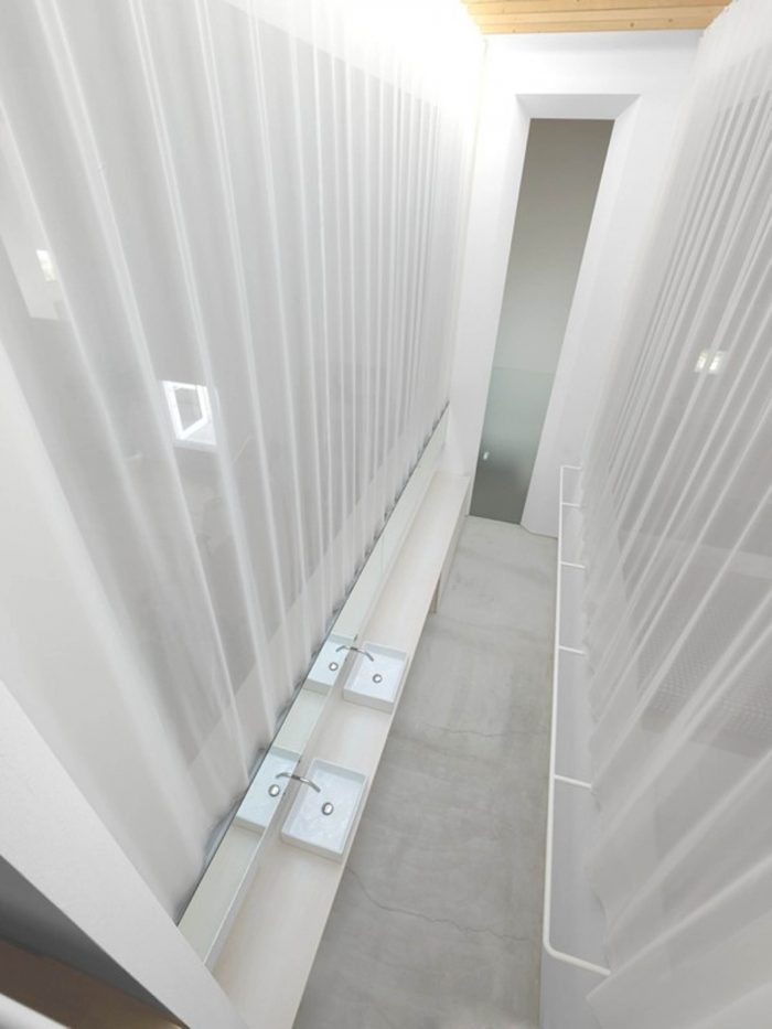 Plan surrounds the two halls (living dining/master bedroom) and washing room by small rooms , which form a buffer zone. Washing room has top light and it introduce the light to the entire of house. And also curtain make diffuse light. By creating a buffer zone, it makes improving in thermal environment, and also can connect on human psychology and the surrounding environment. Natural environment is a great presence. But sometimes it sudden change to a stern expression. This is the architecture that is thinking the relationship between the natural environment and the indoor environment continues to change daily.