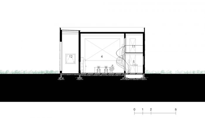 计划用小房间包围两个大厅(客厅、餐厅、主卧室)和洗衣房,形成一个缓冲区。洗手间有顶灯,它把光线引入到整个房子里。同时,窗帘也使光线扩散。通过创造一个缓冲区,它使热环境得到改善,也能使人的心理和周围的环境联系起来。自然环境是一个伟大的存在。但有时它也会突然转变为一种严厉的表现。这就是建筑,它在思考自然环境和室内环境之间的关系每天都在变化。
