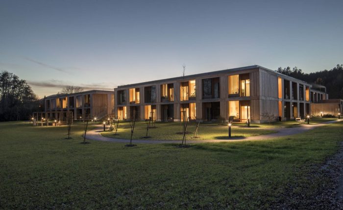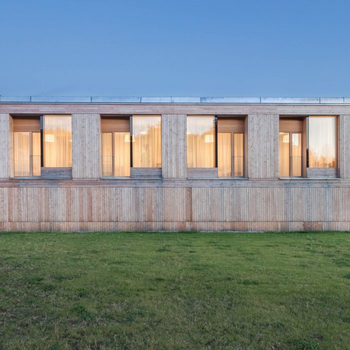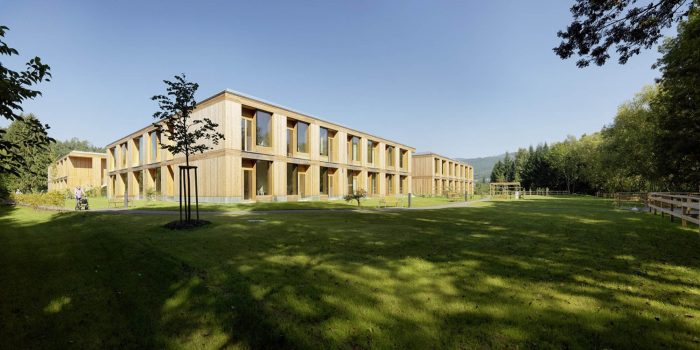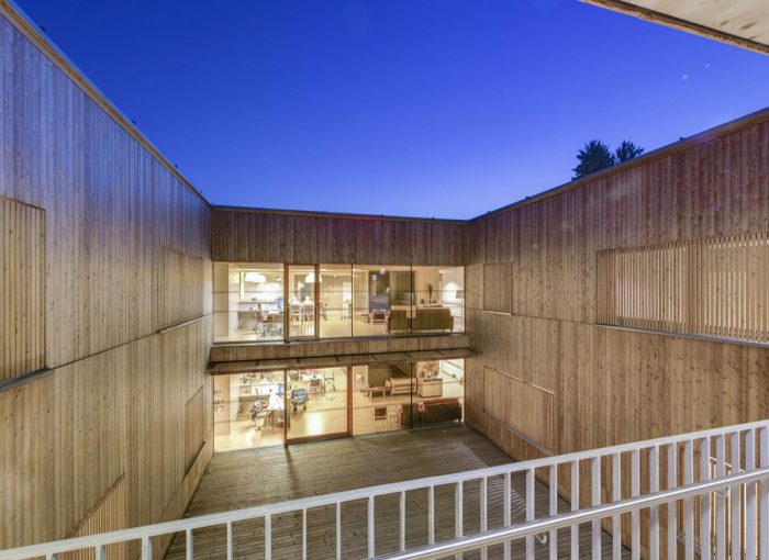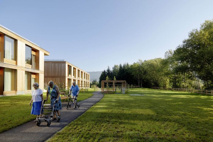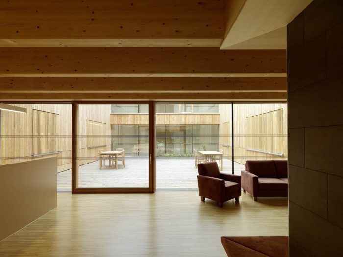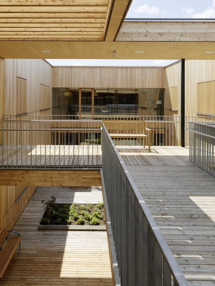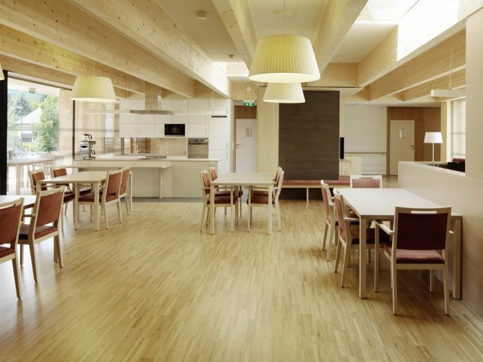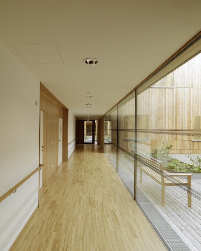 The two-storey building consists of four wings arranged around a semi-public “village square”, designed to host various events. This is also the location of the roofed vestibule, the central nurses’ station, an oratory, a cafe, a hairdresser as well as an open, tended atrium.
