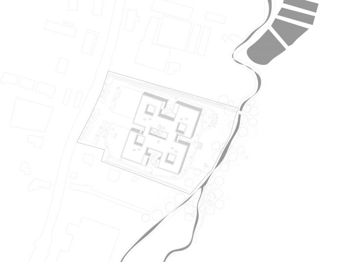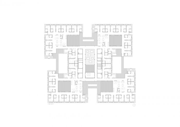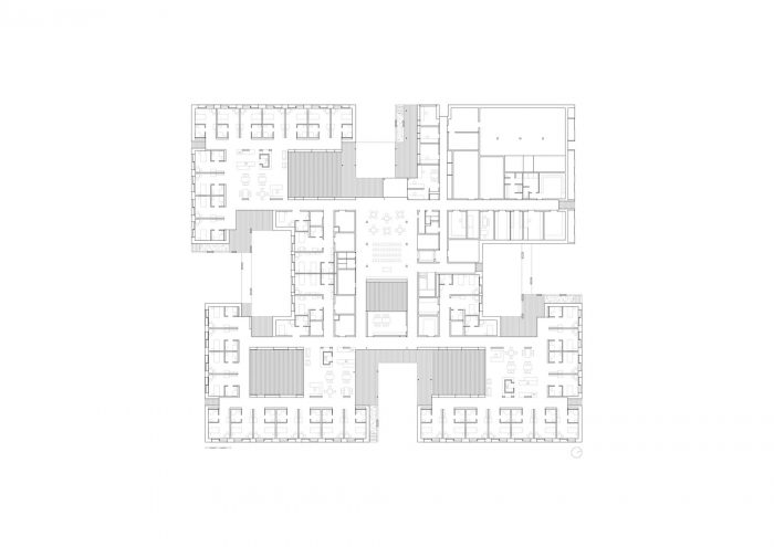 这座两层楼的建筑由四翼组成,围绕着一个半公共的 "乡村广场",设计用于举办各种活动。这里也是有屋顶的前厅、中央护士站、演讲厅、咖啡馆、理发店以及一个开放的中庭的所在地。