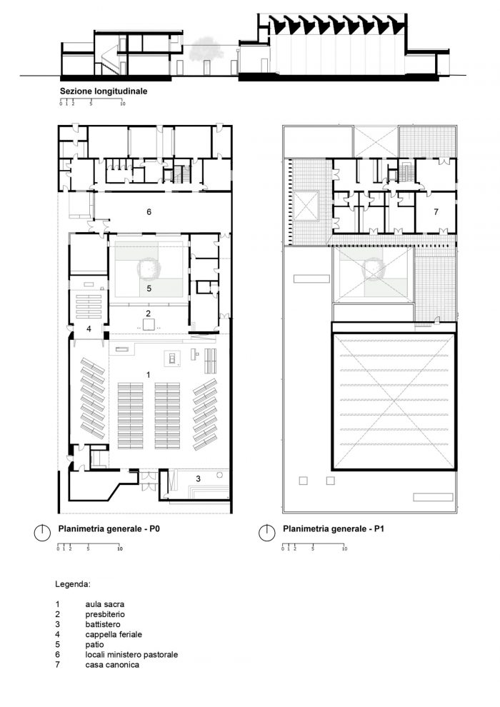 In addition to the large liturgical space accommodating over 400 worshippers, the rectory and catechism rooms, there are spaces for study, play and community-support activities. It is a complex of some 1700 square metres of usable surface, with green areas and parvis with the new bell tower.