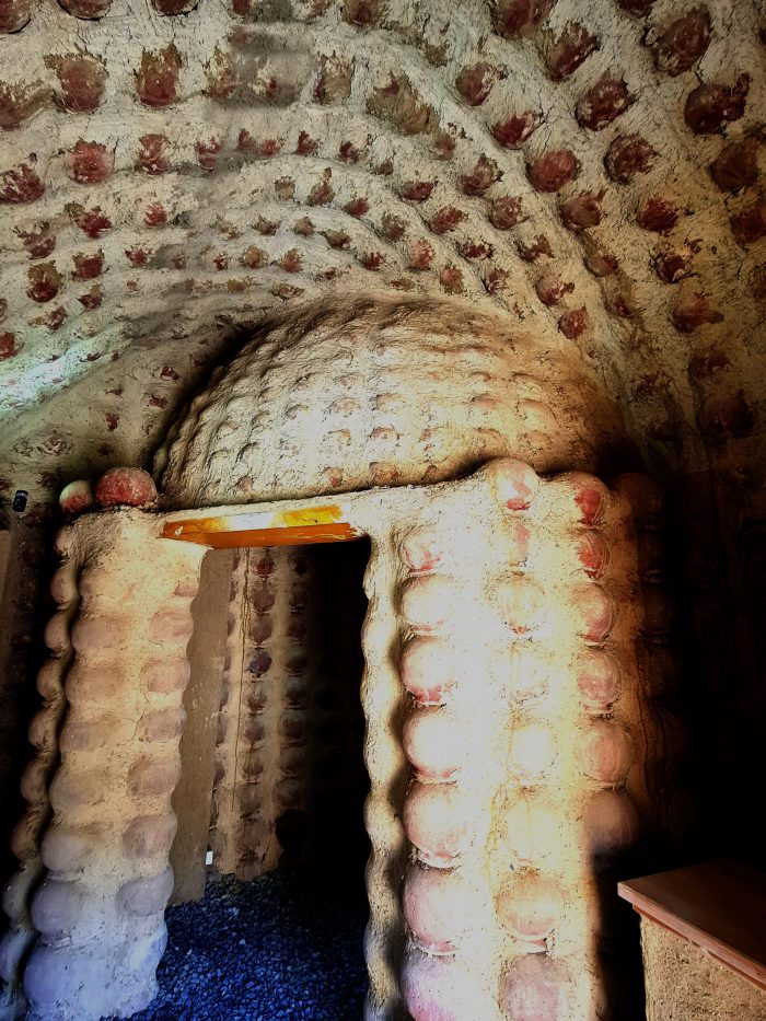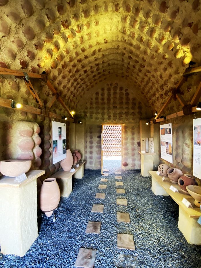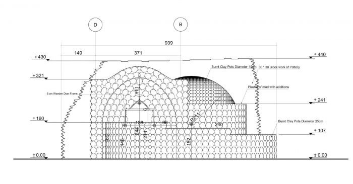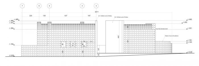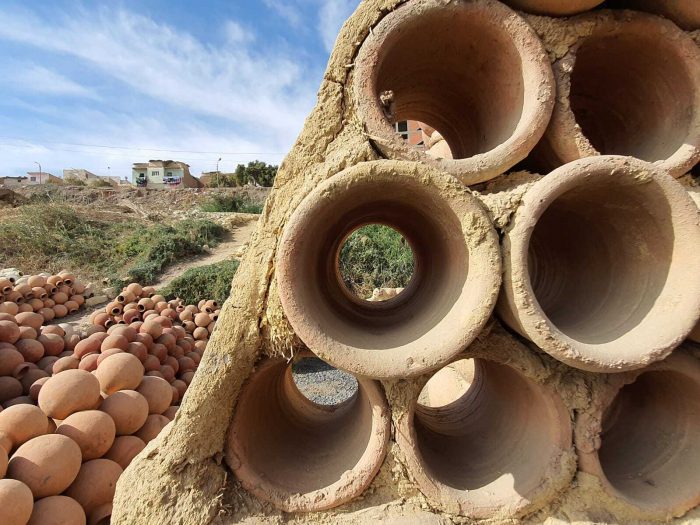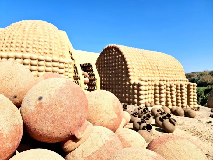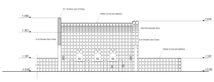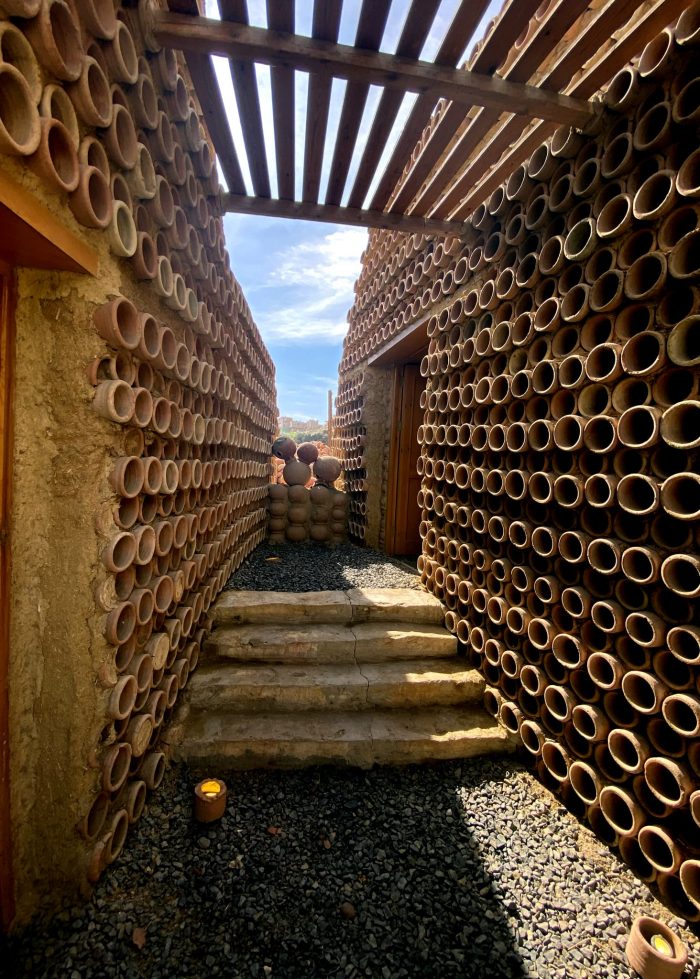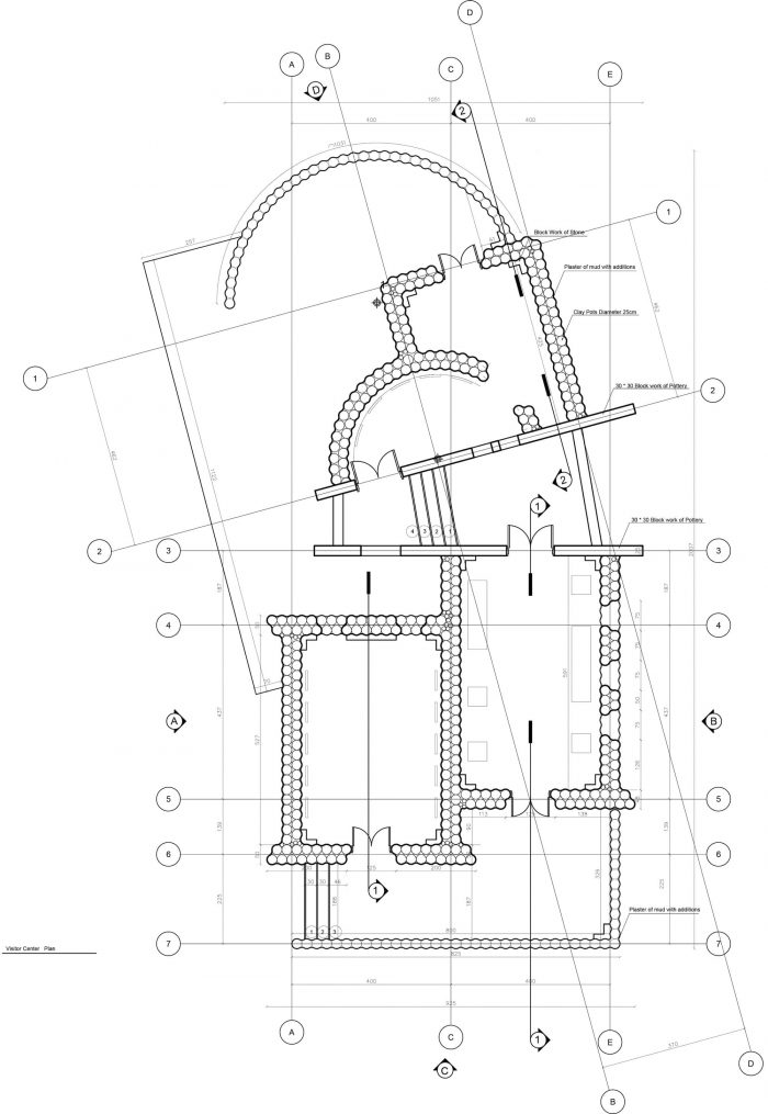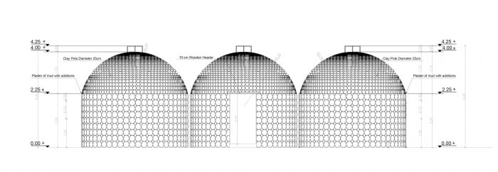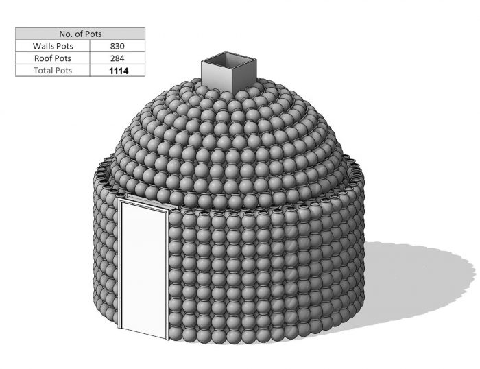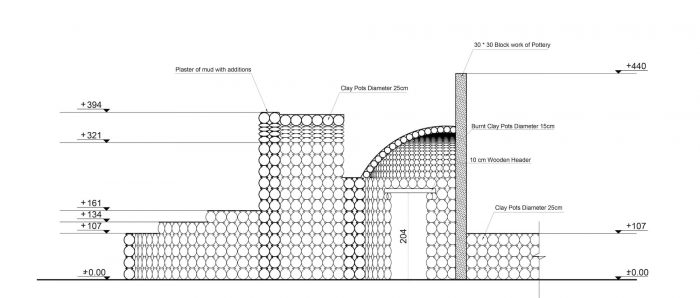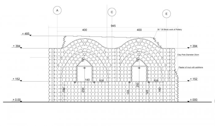 The interlocking of the pots forms a continuous arch, which creates a load-bearing mechanism. The variations and repetition of the load-bearing elements create a variety of spaces and roof treatments. Climatic sustainability stems from the zero-waste process adopted in the construction technique. The Visitor witnesses a powerful environmentally friendly climatic nature in terms of adequacy of internal temperatures and its coherence with the surrounding nature.