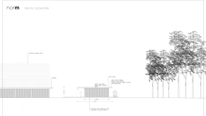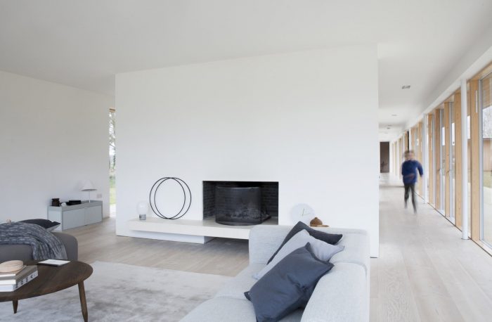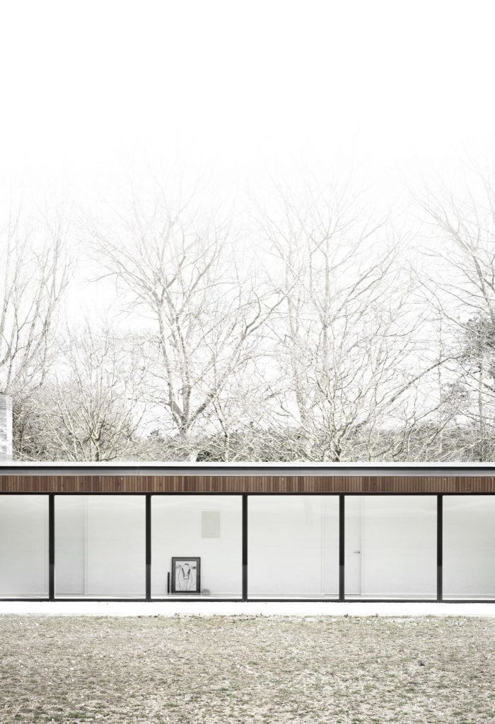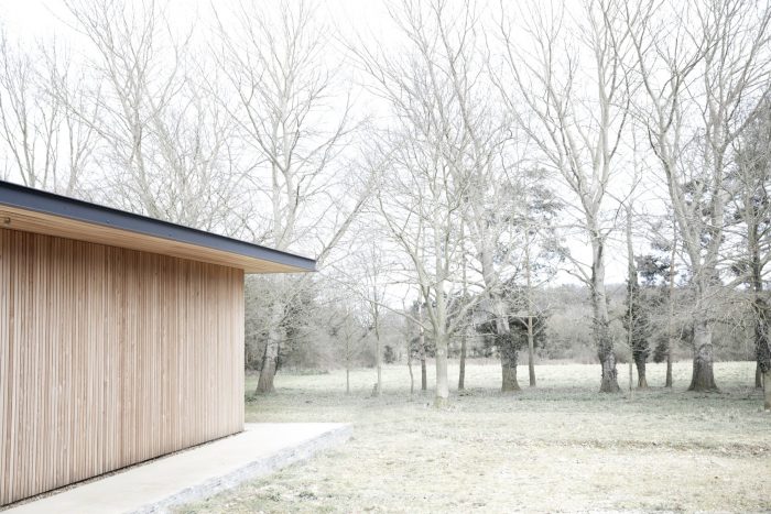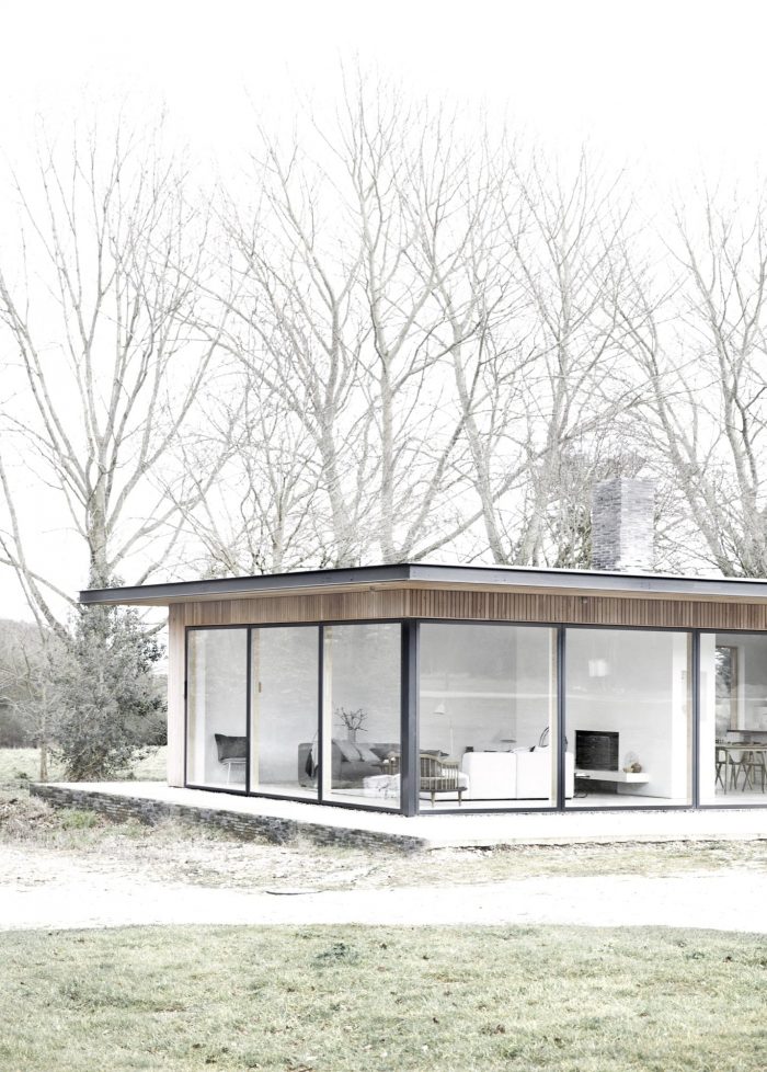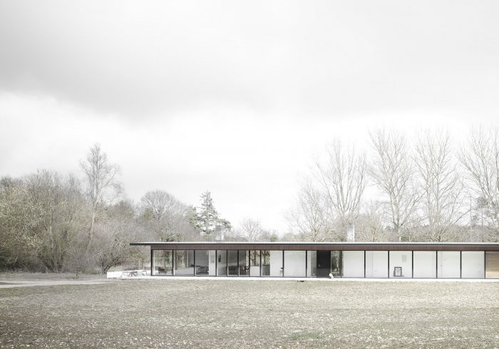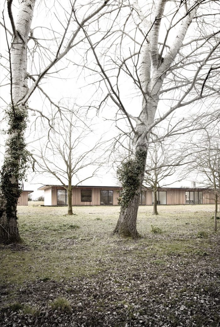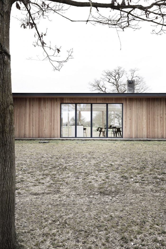Situated on the border of a working farm in Suffolk (UK), the Scott House has been designed as a long and narrow flat roofed pavillon, to give the building a sufficient magnitude and scale to correspond sizes of the existing barn and the old dairies on the site. The long structure is placed on the edge of the property, perfectly conveying the transition from the meadowlands to the cultivated farmland and private enclosed garden.