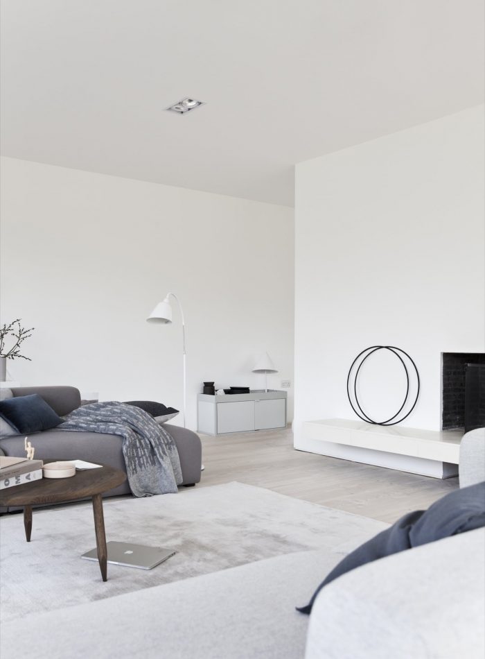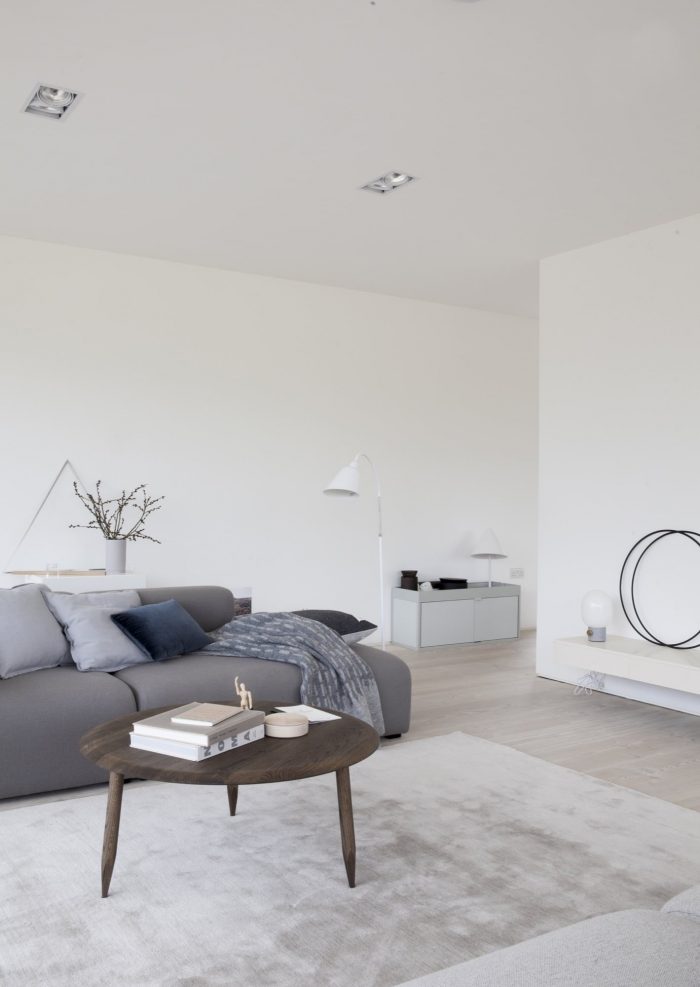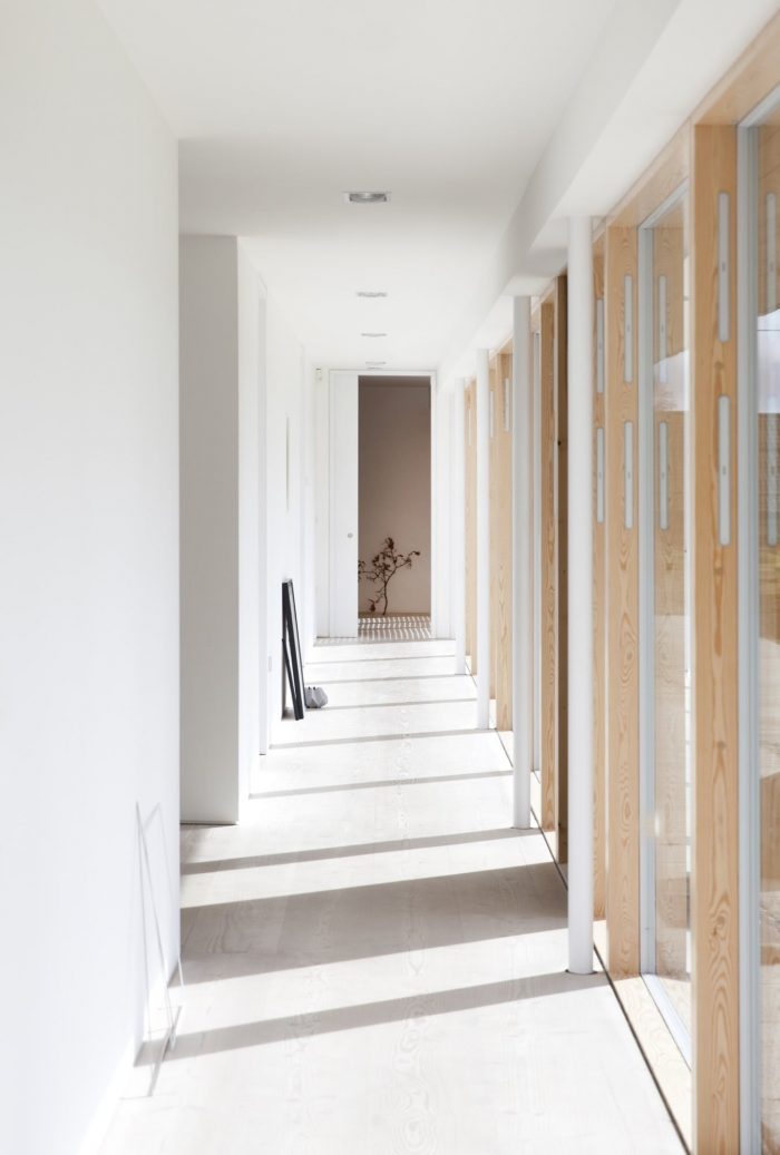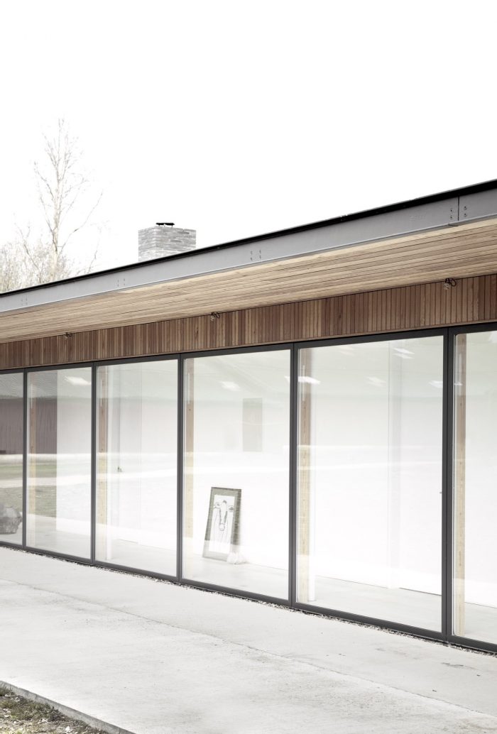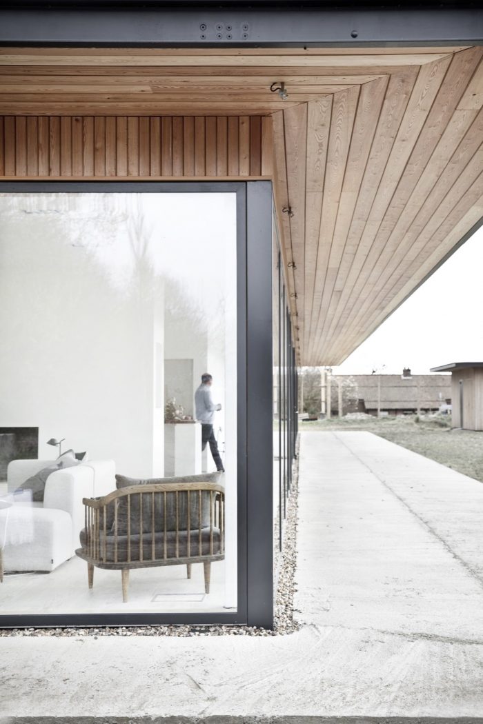 The house is lifted on a slightly elevated sand stone plateau, that serves to lift the building slightly to a level that matches the gentle slope of the site from the East towards the West, which provides the interior with a view over both the garden and the fields in the horizon. The large overhang of the roof and the thin fascia board makes the building as light and airy as possible.