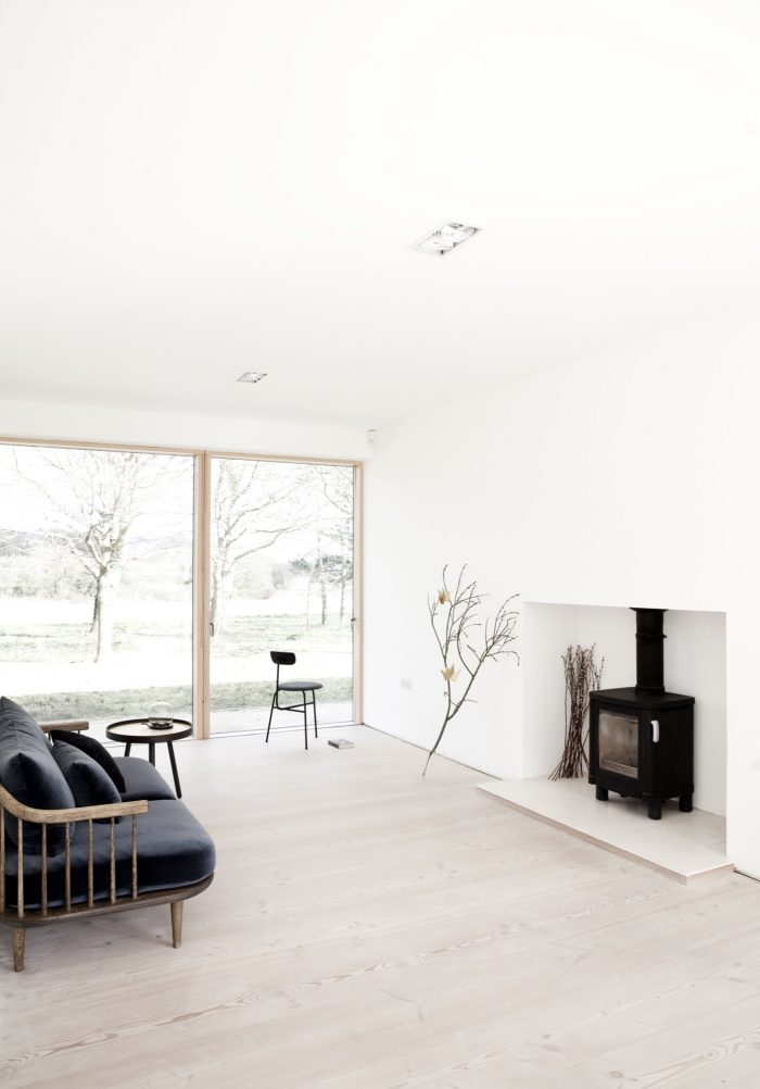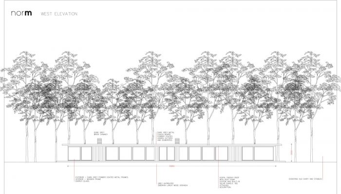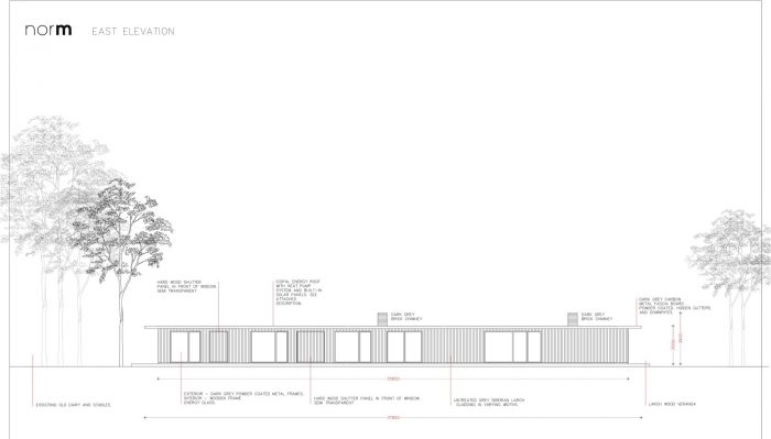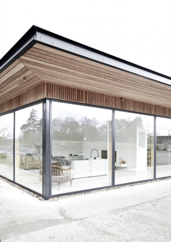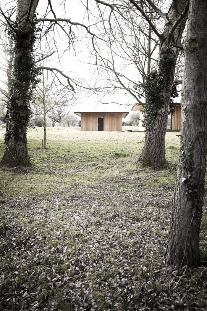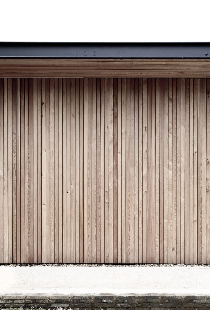 The house is constructed in wooden beams with a vertical cladding in local Larch to correspond with the vertical wooden cladding on the existing structures on the site, creating a harmonious meeting between the old and the new buildings.