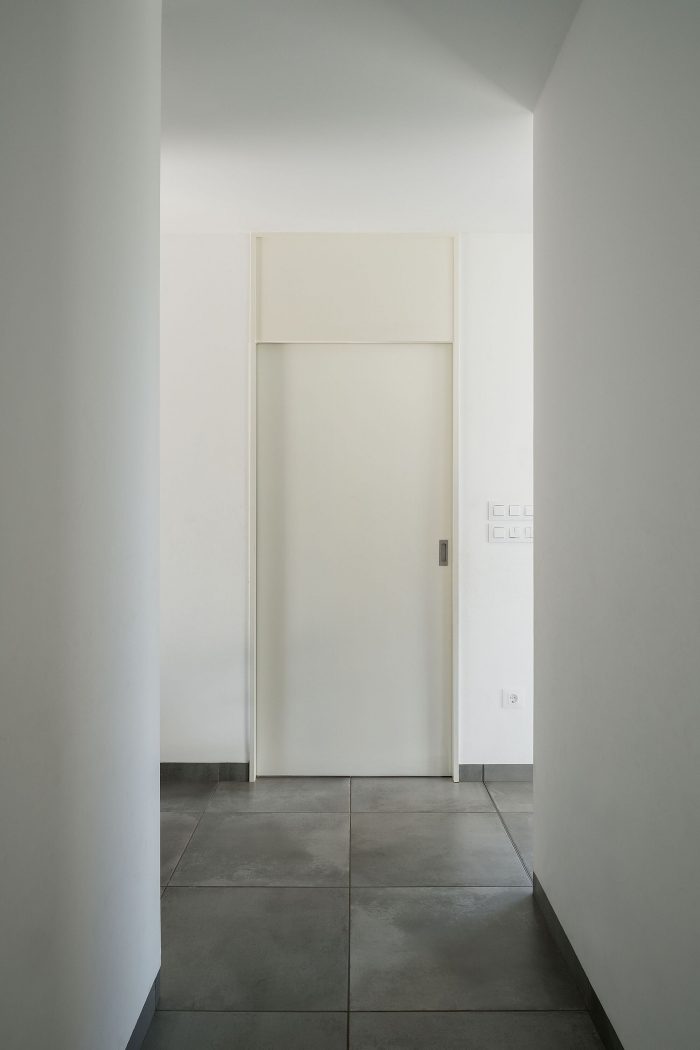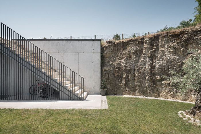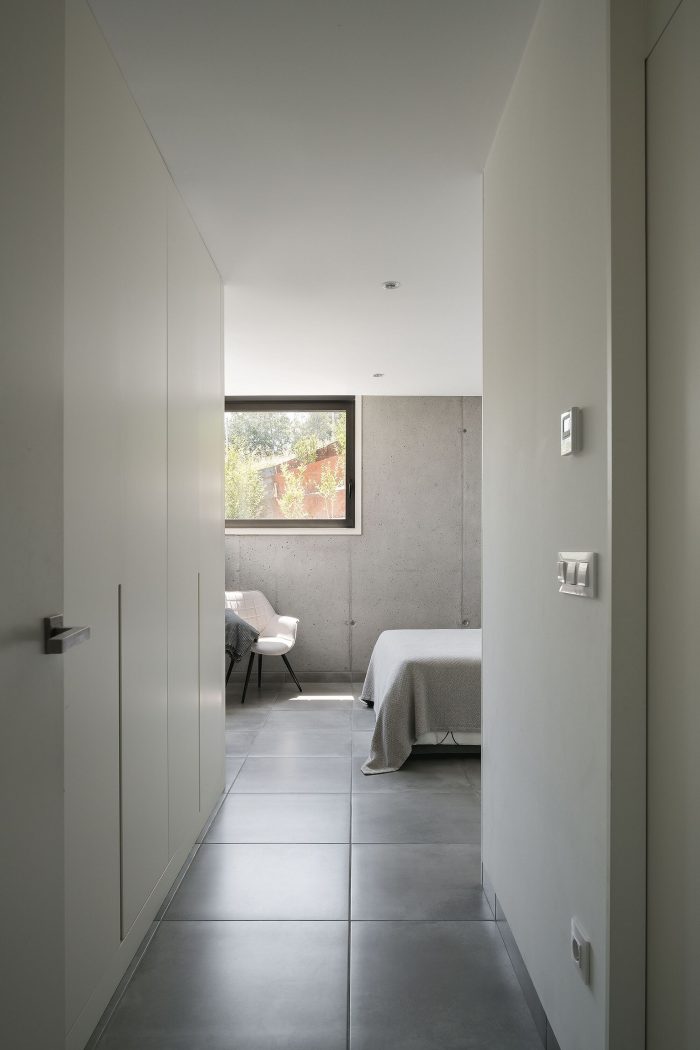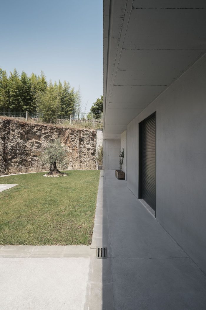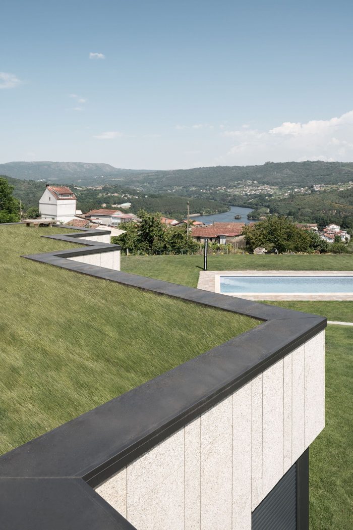 The excavated patio of the house works exactly the same, the service rooms [Garage, Installations/storage room, Multipurpose Room, Kitchen, Toilet, Playroom, and Laundry room] open to it. On the contrary, the served spaces [Living Room and Bedrooms] open onto the plot. The staircase goes up to the watchtower that is the walkable green roof, an incredible place to get lost contemplating the beautiful meander of the Miño river. The house adapts to the environment, closes to the north, and opens to the south [breaking the corners of the living room and bedrooms]. Cross ventilation is sought [Patio-Plot]. The surrounding terrain protects it and gives inertia to the rooms that regulate the interior temperature.