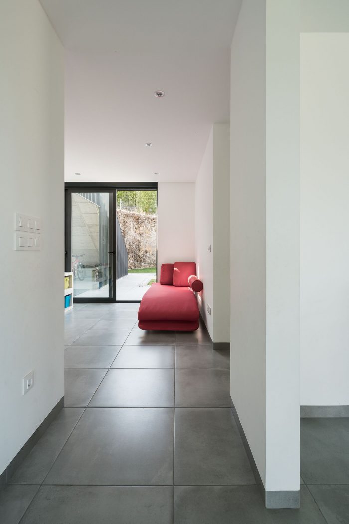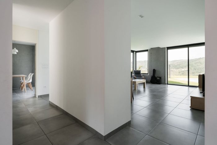 房子的挖掘天井的作用完全相同,服务房间[车库、安装/储藏室、多功能室、厨房、厕所、游戏室和洗衣房]向它开放。相反,服务空间[客厅和卧室]向小区开放。楼梯通向瞭望塔,这是一个可行走的绿色屋顶,是一个令人难以置信的地方,可以让人迷失在米诺河的美丽蜿蜒中沉思。房子适应环境,向北关闭,向南开放[打破客厅和卧室的角落]。寻求交叉通风[天井-地段]。周围的地形保护了它,并给了调节室内温度的房间以惯性。
