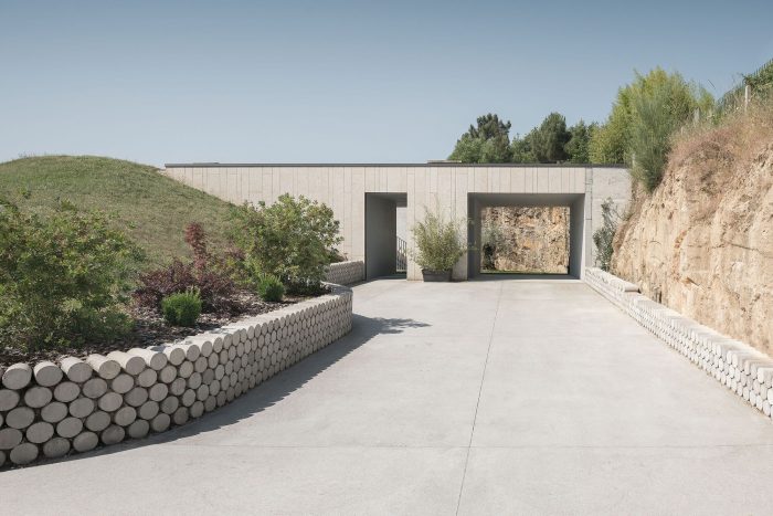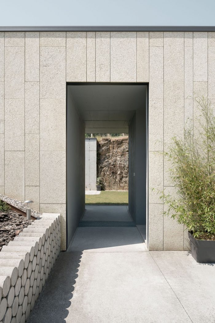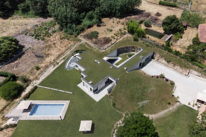 The intersection of the landscape and the relationship between the three main pieces (Existing House, New House, and Pool) causes the need to obtain a common “0 level”. Thus came the idea of burying the house and creating a limited and intimate space for the new residence. The proposal is based on the layout of a traditional house from the southern part of the province of Ourense, which is laid around a courtyard enclosed by large walls. In this typology, the access is through a large wooden gate. Next to this wall were the services [Bodega, Alpendres y Almacenes] and the Hórreo. From the patio, a staircase led to the house on the top floor, below the stables.
