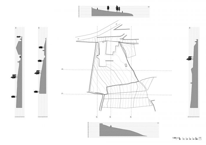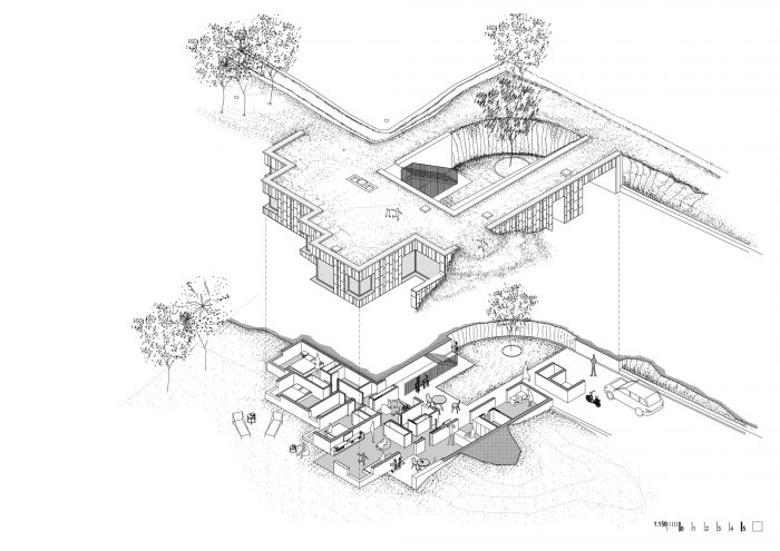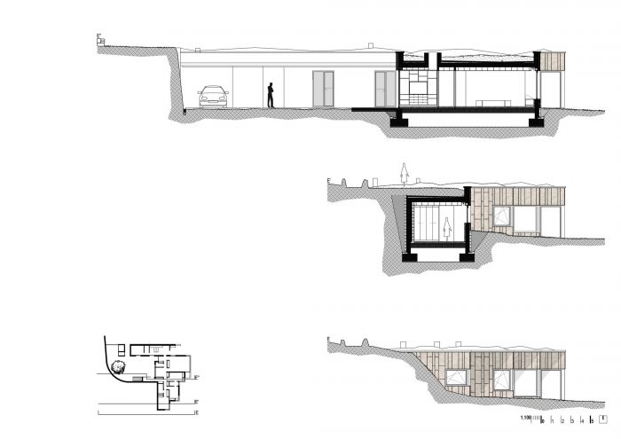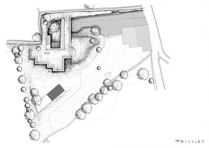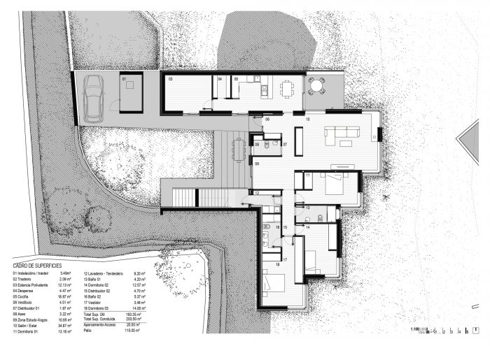 景观的交叉点和三个主要部分(现有的房子、新房子和游泳池)之间的关系导致需要获得一个共同的 "0水平"。因此,产生了埋葬房子的想法,并为新住宅创造一个有限的、亲密的空间。该提案基于奥伦塞省南部地区的传统房屋布局,它围绕着一个由大墙围起来的院子布置。在这种类型中,通道是通过一个大木门。在这堵墙的旁边是服务机构[Bodega, Alpendres y Almacenes]和Hórreo。从天井里,有一个楼梯通向顶层的房子,在马厩下面。