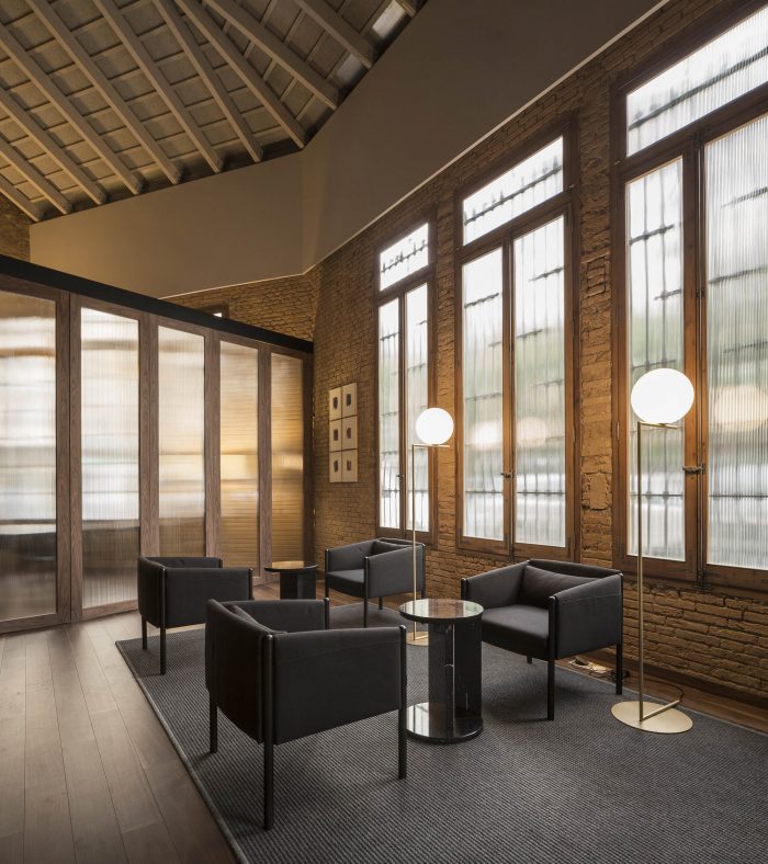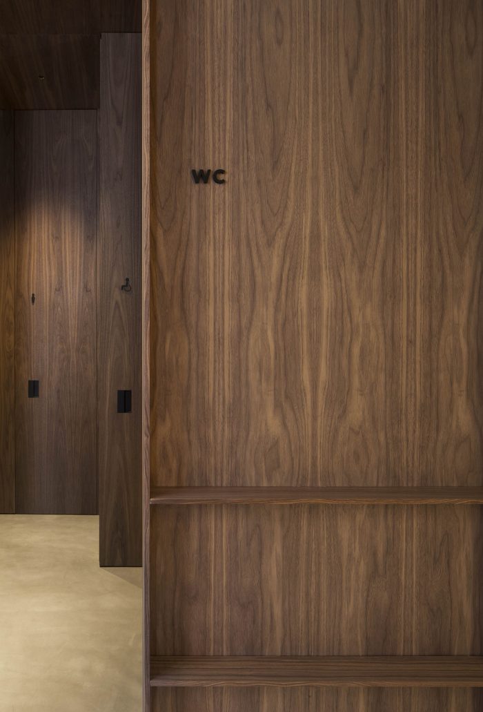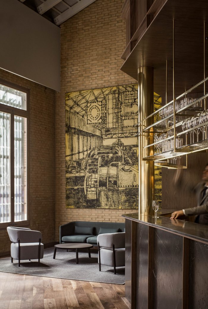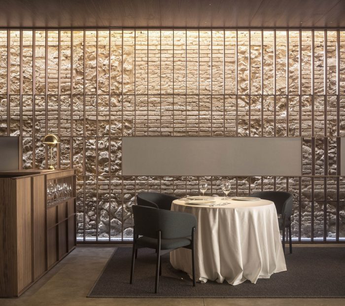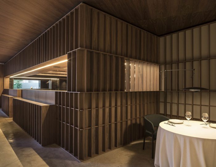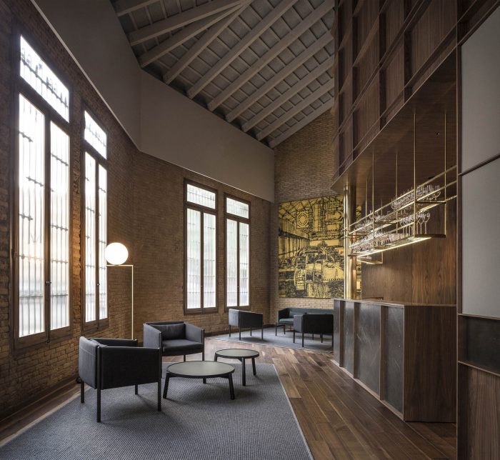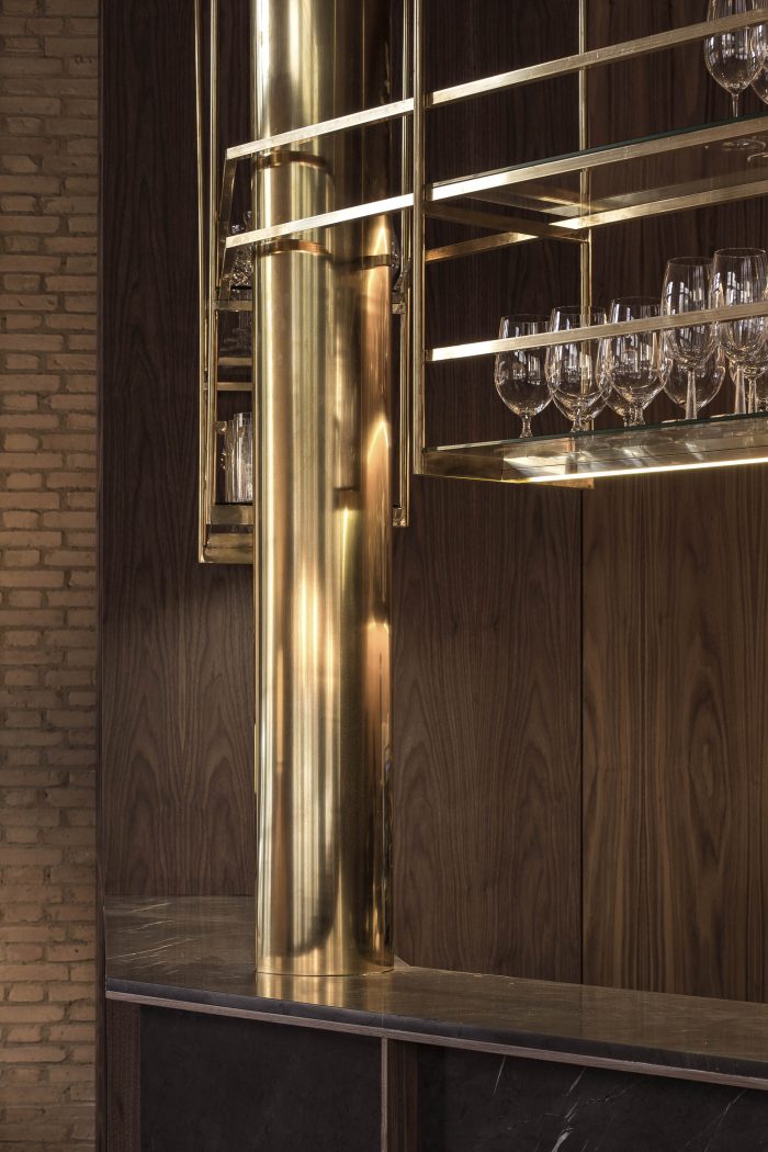 In the first, in search of a meaningful integration of shape, color, and texture, a second skin is designed to cover the entire space integrating the different planes of the room. The wrap is expressed in American walnut wood that contrasts with the beige color of the brick. This juxtaposition of textures in contrast with concrete pavement visually softens the project and at the same time reminds the industrial past of the premises, giving it a category Michelin entity.