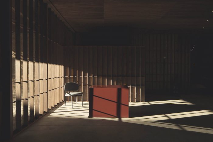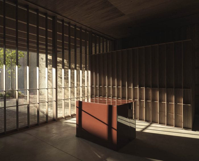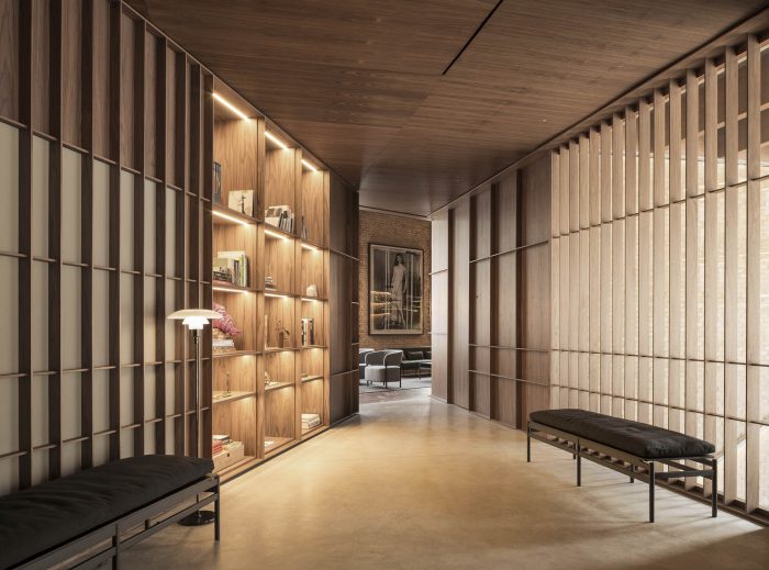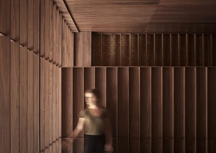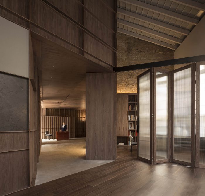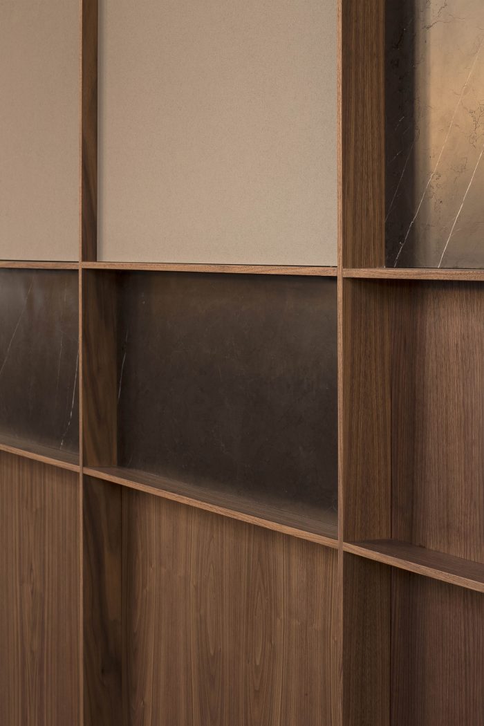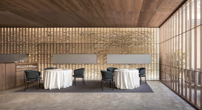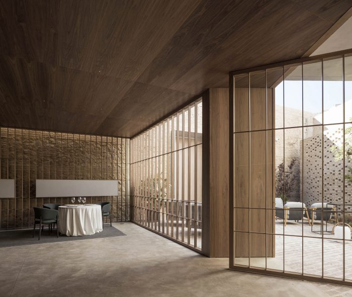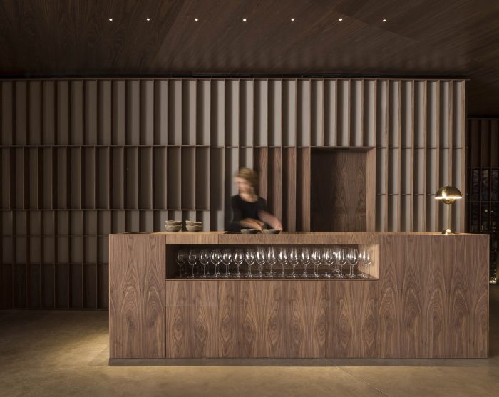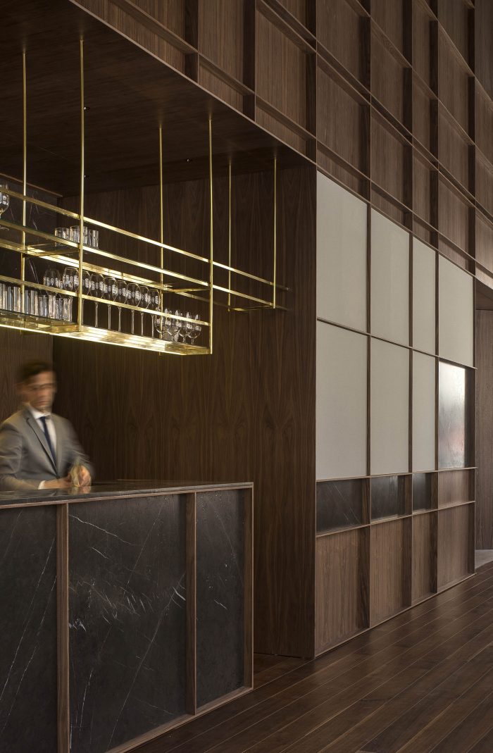 In the first, in search of a meaningful integration of shape, color, and texture, a second skin is designed to cover the entire space integrating the different planes of the room. The wrap is expressed in American walnut wood that contrasts with the beige color of the brick. This juxtaposition of textures in contrast with concrete pavement visually softens the project and at the same time reminds the industrial past of the premises, giving it a category Michelin entity.