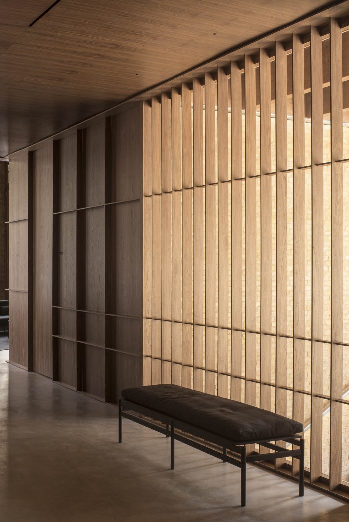 在第一处,为了寻求形状、颜色和质地的有意义的整合,设计了第二层皮肤来覆盖整个空间,整合房间的不同平面。包皮用美国胡桃木表现,与砖的米色形成对比。这种与混凝土路面形成对比的纹理并列,在视觉上软化了该项目,同时也提醒了该场所的工业历史,使其成为米其林类别的实体。