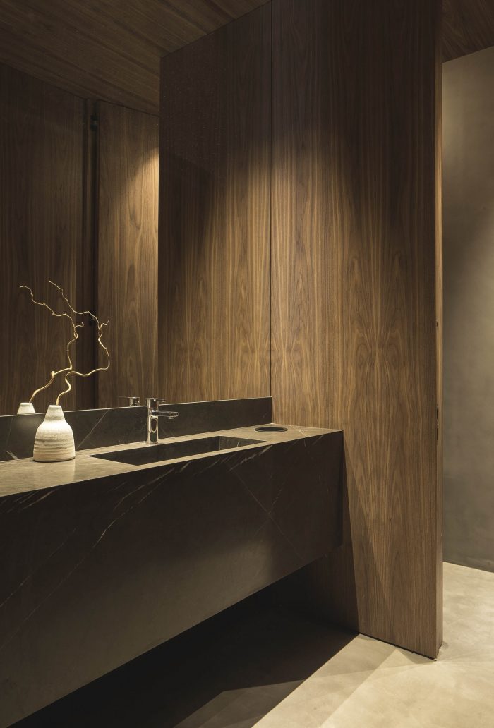 该酒吧是一个修复过的结构,最大高度达8米。暴露的砖和梅利斯木围墙被保留在这个区域,用作等待空间、开胃酒,甚至是可容纳约25人的保留区。工作室用Stonehegen公司的天然石材Pietra Grey设计了脸盆、桌子之间的分隔元素、酒吧的前面和后者的部分衬里。