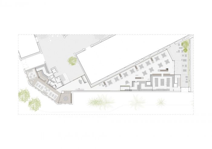 矛盾的是,一个残留的区域成为新的餐厅,在这里,形式是绝对必要的。餐厅分为两个主要区域,占据了一个三角形的表面,为工厂的一面墙提供了宝贵的视角,而酒吧则被安置在五个翻新的大棚之一下。