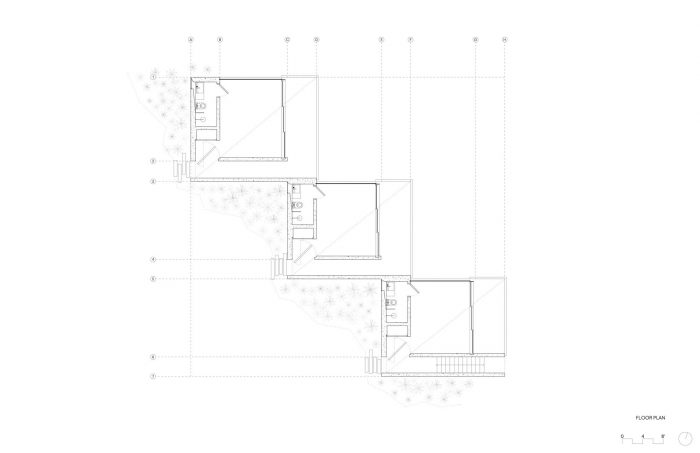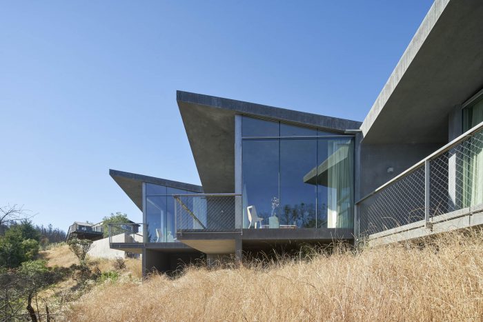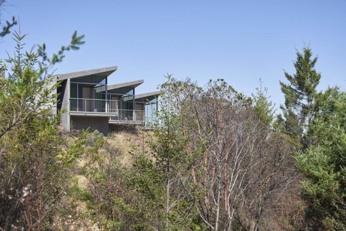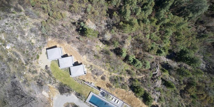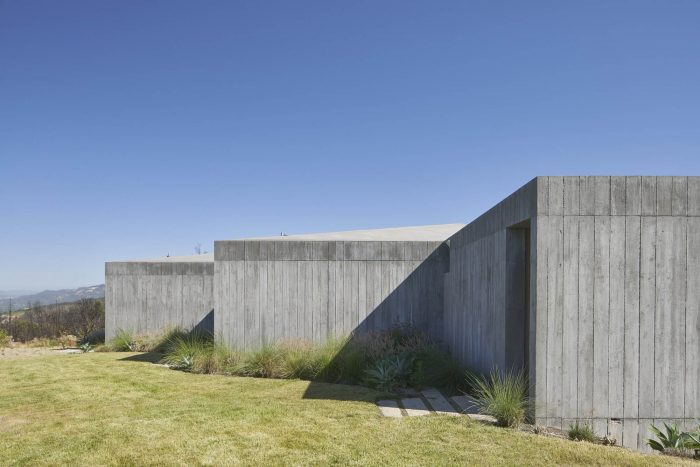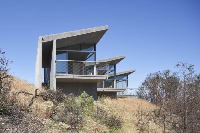 The owners requested three private guest areas each with a separate entrance, en- suite bathroom, and outdoor terrace. Given the existing ecology and desire for a low- maintenance project, the owners were interested in robust, fire-resistant building materials for the guesthouse from the onset of the design process. Eventually board-formed concrete was chosen for its organic quality, tactility, and inherent ability to integrate into the rocky hillside. The board-forming allows the concrete to be both modern and connected to the history of wood construction in the area.