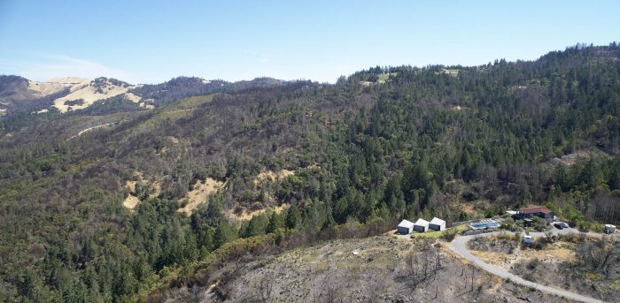 这片18英亩的土地与远处起伏的山丘交相辉映,提供了很少的自然平坦的可建区域。虽然这使施工变得复杂,但地形提供了广阔的视野,并将该物业从公众视野中屏蔽。曼萨尼塔树林和松树林山坡环绕着一个小高原,宾馆和配套的游泳池就坐落在那里的私人全景中。随着加州山坡的荒芜,野火的风险也不断出现。当项目接近完成时,2017年的修女野火吞噬了该物业。周围的森林和草地被摧毁了,但全混凝土的宾馆在这次事件中幸存下来。