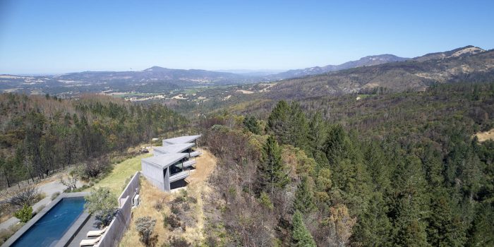 The 18-acre property mirrors the undulating hills beyond, providing little naturally flat, buildable area. Though it complicates construction, the topography affords expansive vistas and screens the property from the public view. Manzanita groves and pine-forested hillsides encircle a small plateau where the guesthouse and accompanying pool nest within their private panorama. With the wild, untouched California hillsides come the constant risk of wildfire. As the project was nearing completion, the 2017 Nuns Wildfire engulfed the property. The surrounding forests and meadows were devastated, but the all- concrete guesthouse survived the event.