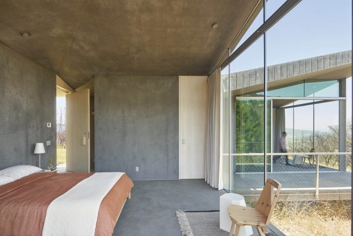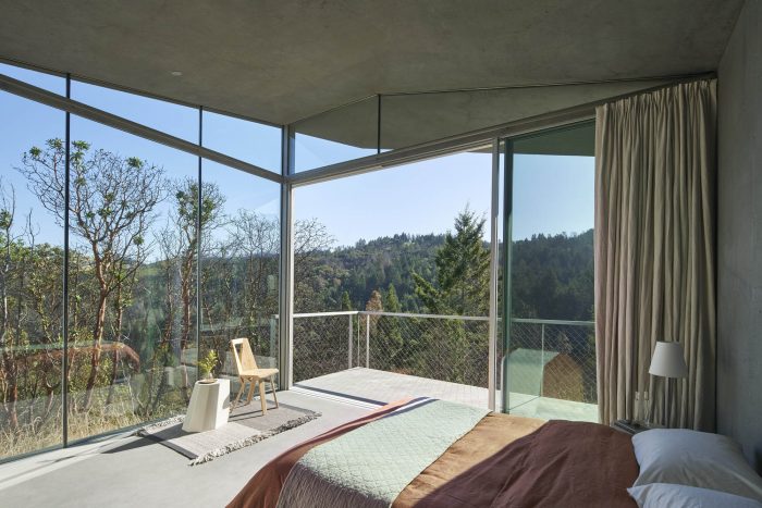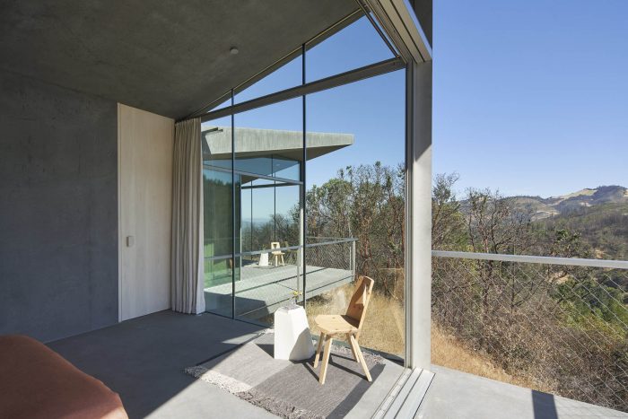 The guesthouse’s siting, form, and materiality play with perception to craft dramatic, peaceful spaces within. From the shared perspective of the adjacent pool and garden plateau, the three volumes are solid, concrete prisms. Upon entering and passing through what feels like a heavy concrete threshold, space expands and gives way to complete openness and continuity with the landscape, offering arresting views of nature and taking full advantage of Sonoma County’s mild weather. Glazed enclosures delicately inscribe the rooms to enhance this spatial and material contrast, allowing the concrete planes to remain the definitive architectural element. The floor slabs, rooted in the hillside, float out over the steep ground below and poise each bedroom with its own privileged, private view.