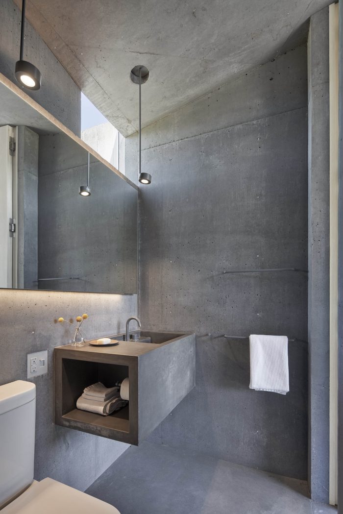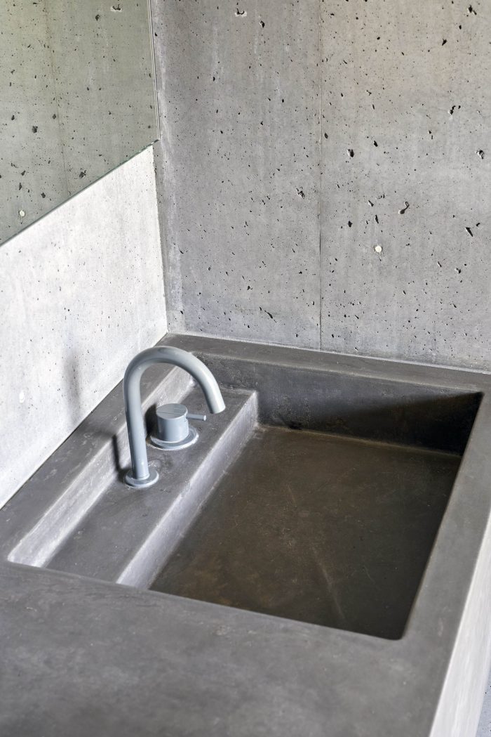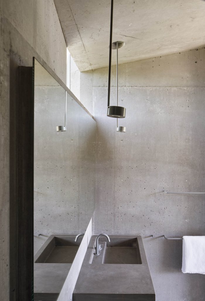 To create a more subdued texture on the interior, the concrete finishes in the bedrooms are smooth, formed with large panels instead of wood boards. Designed by the architects, light and warm pine doors form a contrast to the colder concrete and glass surfaces. All doors are made of solid pine with a lye treatment and punctuated with custom-designed carved wood door handles. The shape of the handles is rounded and chunky, a playful foil against the hard edges of the concrete. The bathrooms further celebrate the single, dominant material and underscore it with a monochrome approach. Mork-Ulnes designed the precast concrete vanities to match the structure and dark grey Vola faucets add a pop of glossy texture against the matte concrete.