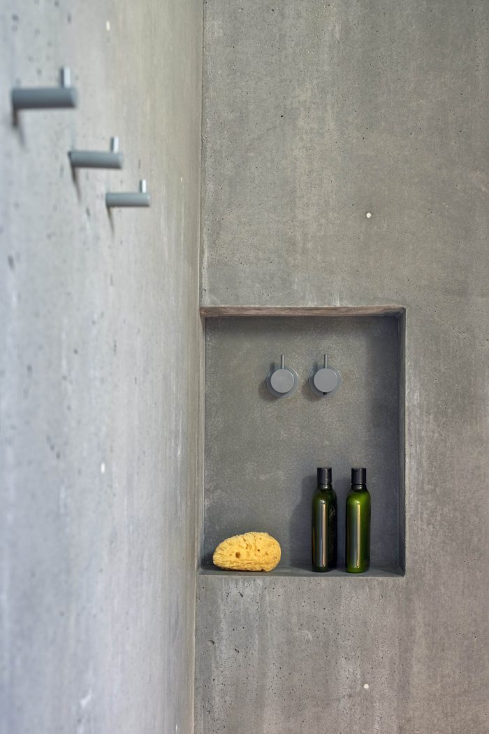 为了在室内创造一个更低调的纹理,卧室里的混凝土饰面是光滑的,用大板而不是木板形成。由建筑师设计的轻盈而温暖的松木门,与较冷的混凝土和玻璃表面形成了对比。所有的门都是由实心松木制成,经过碱液处理,并以定制设计的雕花木门把手作为点缀。手柄的形状是圆润而厚实的,与混凝土的坚硬边缘形成了有趣的衬托。浴室进一步庆祝单一的主导材料,并以单色的方式强调它。Mork-Ulnes设计的预制混凝土盥洗台与结构相匹配,深灰色的Vola水龙头在哑光混凝土的衬托下增添了亮丽的纹理。