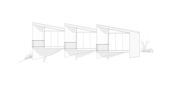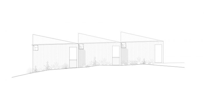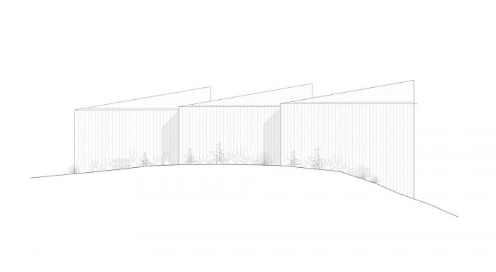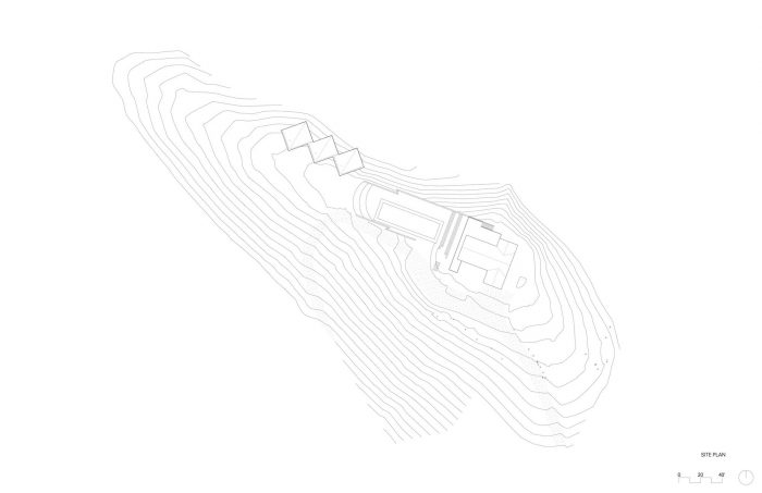 Because of their striking quality, the existing landscape and topography are indelibly present in the architectural solution. To accommodate the separate guest suites, the building is composed of three distinct, compact volumes. The site leads the form: the volumes step down with the grade progressively, nesting into the site’s natural contours so that the mass of the building is softened into the hillside. A continuous, multi-gabled roof joins the discrete units into a coherent whole while its peaks and valleys echo the hills beyond.