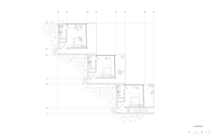 体积的方向远离花园和游泳池的社交区,创造了隐蔽性,但也增强了宾馆的热性能。坚实的混凝土墙和屋顶在夏季最严酷的时候为室内遮挡阳光,相当大的热质量使房间在夏天保持凉爽,在寒冷的日子里保持温暖。屋顶的深层悬垂为室外露台遮阳,并强调了每个客人套房的室内-室外空间的连续性。