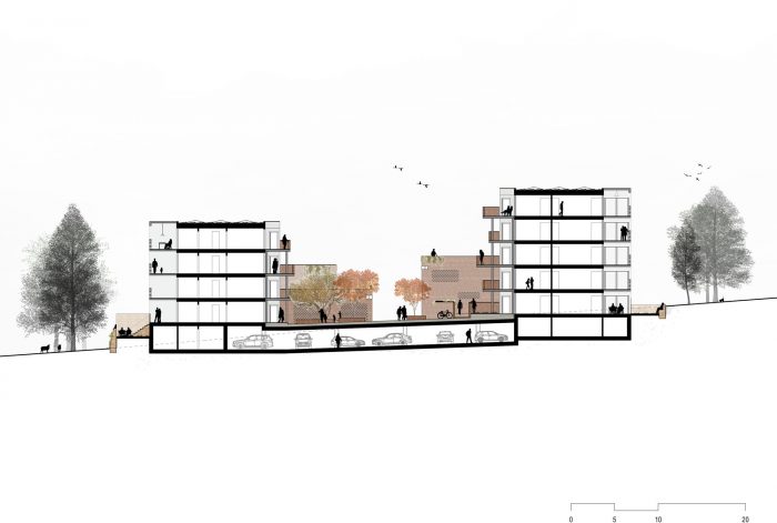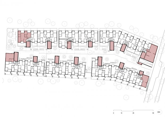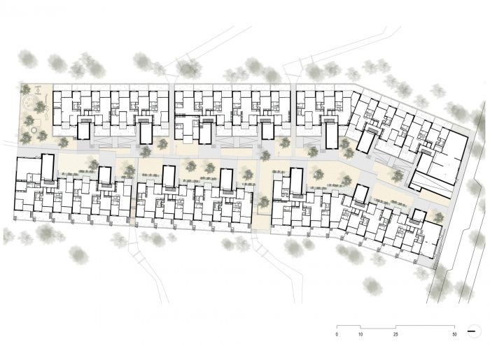 建筑物与环境的结合来自于景观和建筑环境的紧密交织。庭院在住区中起着核心作用,因为它是一个社会互动的空间。