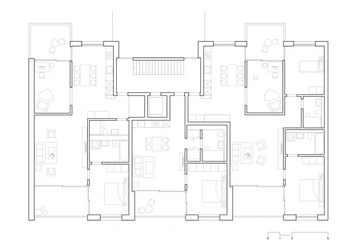The architectural elements of prefabricated brick elements serve as a strong identity and signal a high appreciation of the collective living space. In these elongated, plaza-like courtyards, a neighborly social life can unfold. The expanded courtyard structures contain laundry rooms, stroller rooms, and roof terraces for the respective residencies.