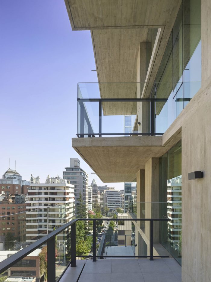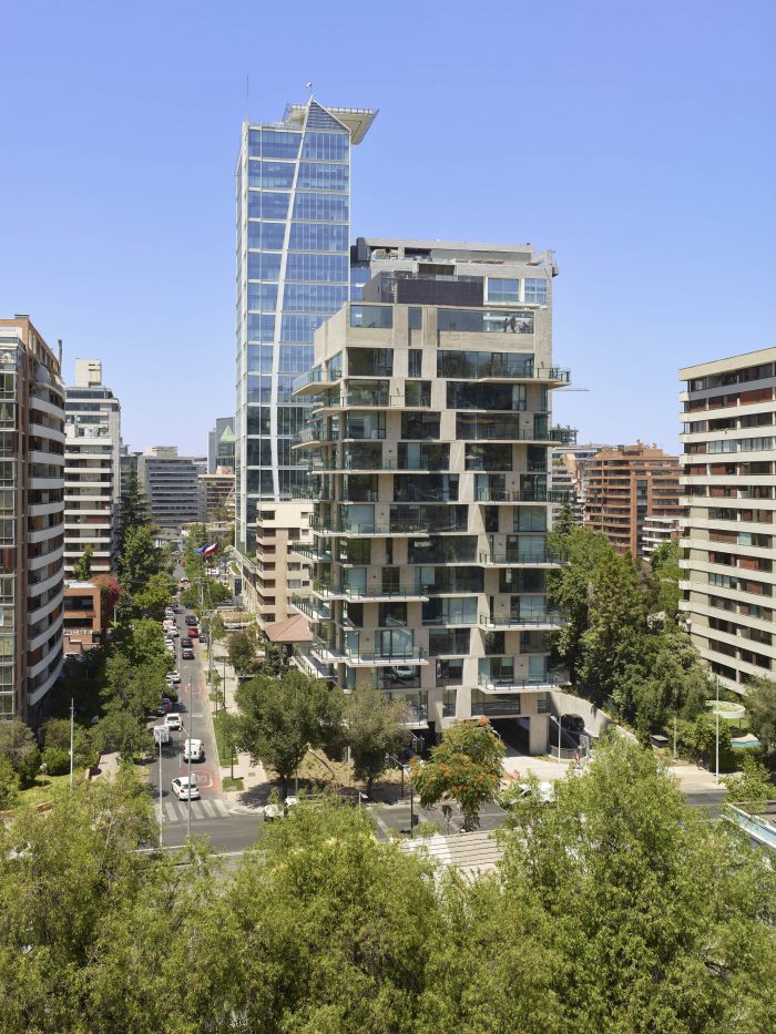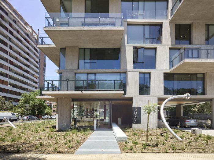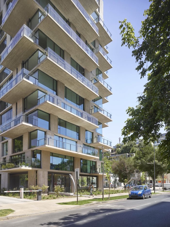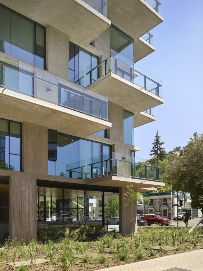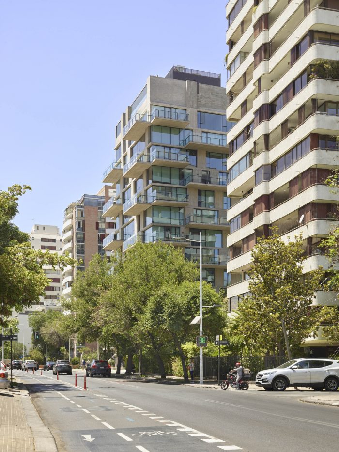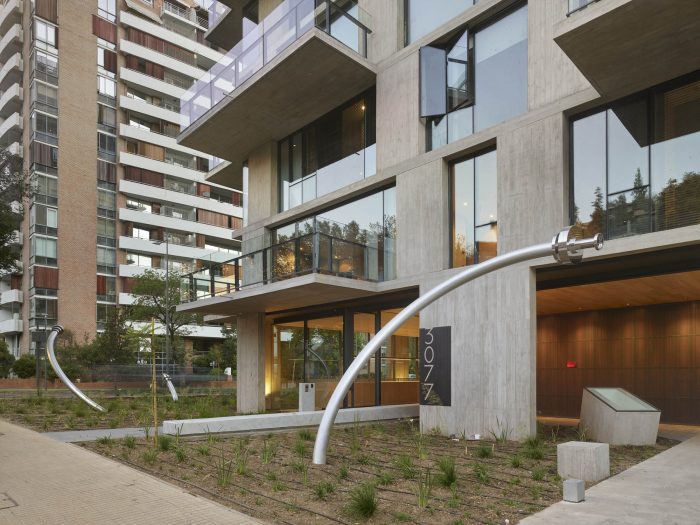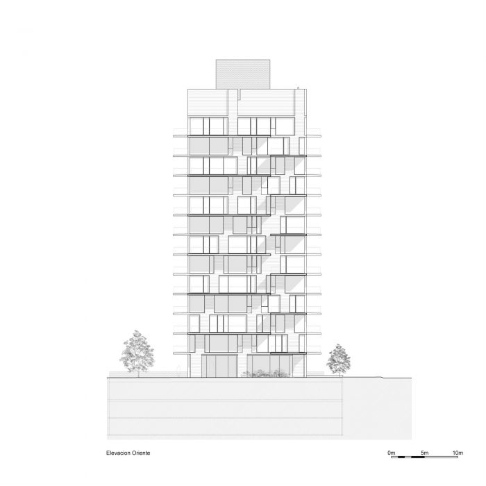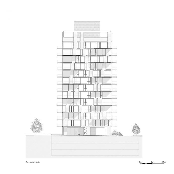 The project frees the first floor for all common use, except the reception, transparent and spacious, surrounded by a garden with sculptures as a pause in the transition from the street to the building. There is no visitor parking, or security gates, but an open green area that gives a different width to the immediate public space. Then a drop-off type car crossing is incorporated as a maneuvering area that complements the access and egress of cars to the building without depending on public roads. The building is developed in an equivalent way towards its four orientations, in order to avoid the scheme of a “front and a back”, allowing to incorporate other views to the units. The structural scheme consists of a system of perimeter columns and a central core. These 144cm x 30cm exposed concrete columns move 72cm along the edge of the slabs in opposing directions. This breaks the vertical serialization of the house in height, with the purpose of increasing the views on the upper floors.