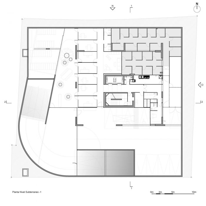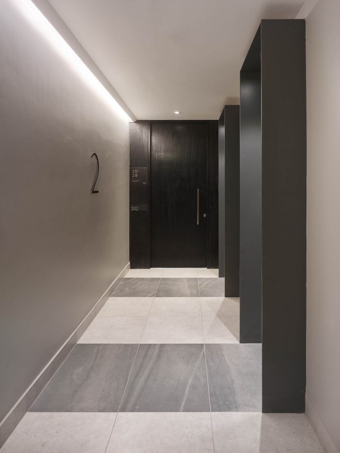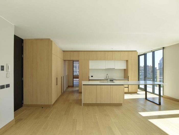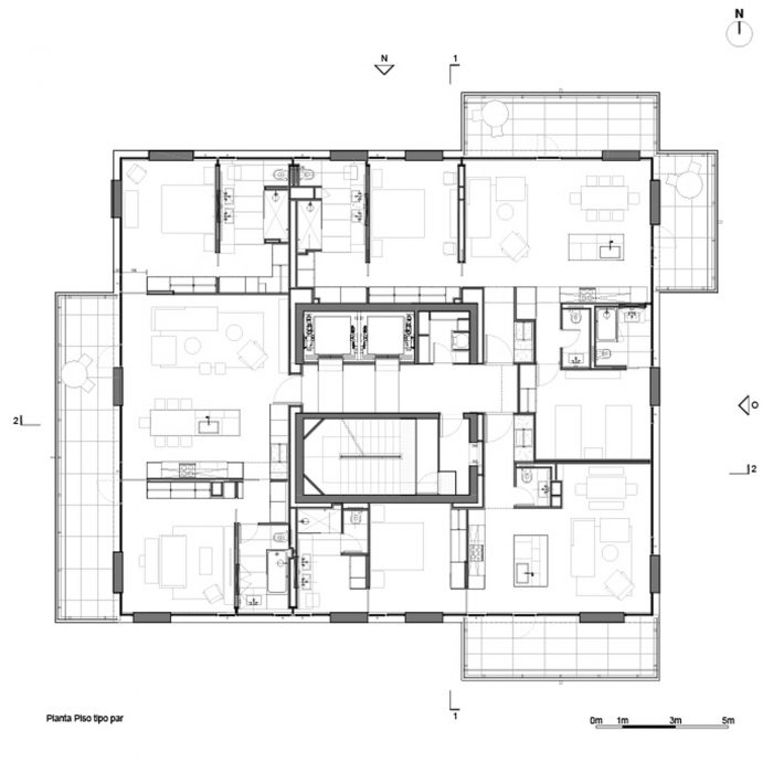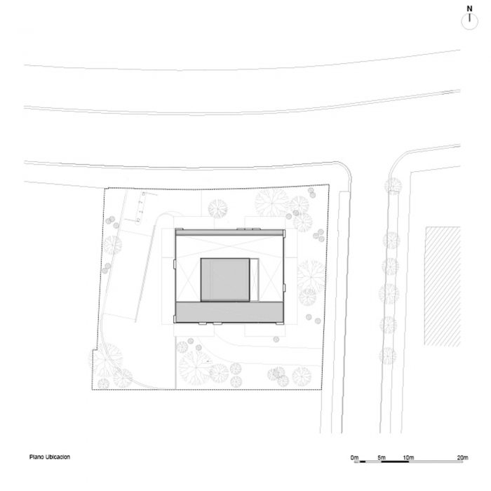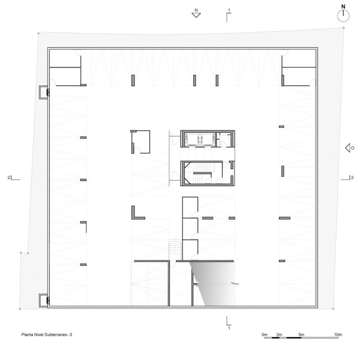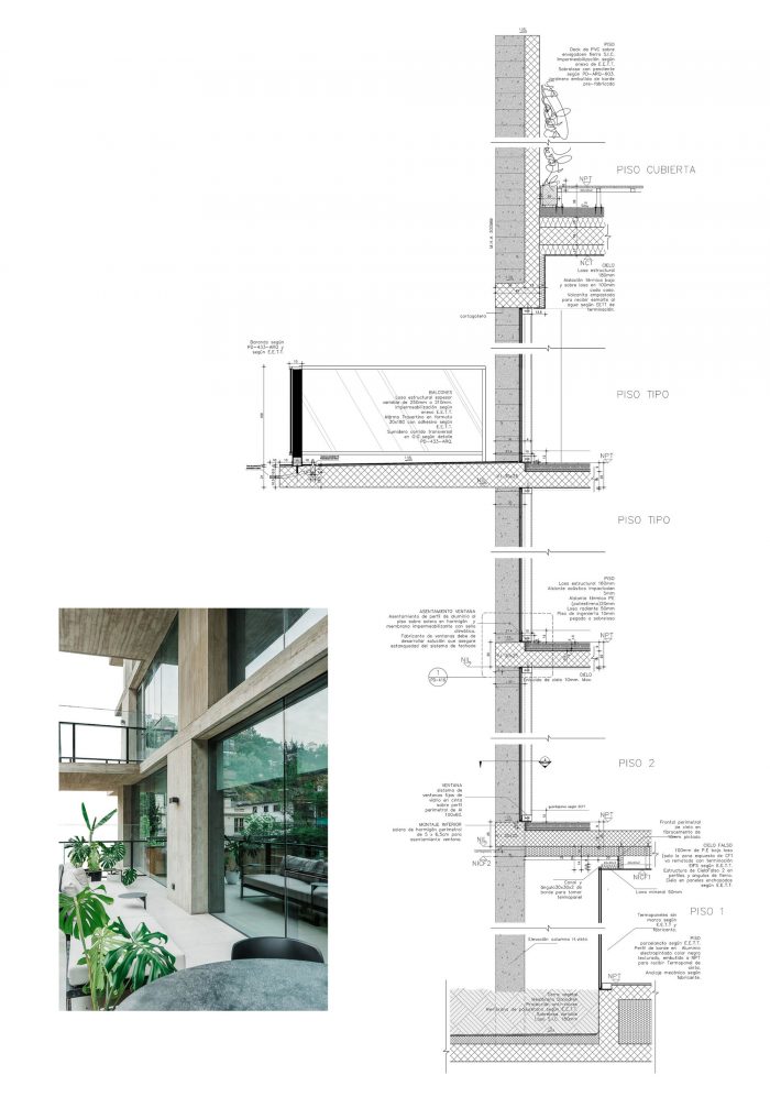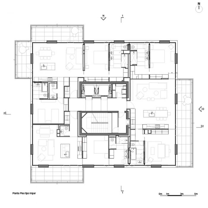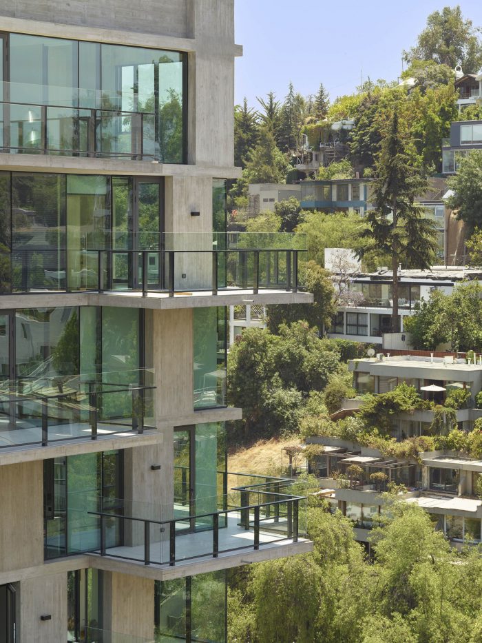 The project frees the first floor for all common use, except the reception, transparent and spacious, surrounded by a garden with sculptures as a pause in the transition from the street to the building. There is no visitor parking, or security gates, but an open green area that gives a different width to the immediate public space. Then a drop-off type car crossing is incorporated as a maneuvering area that complements the access and egress of cars to the building without depending on public roads. The building is developed in an equivalent way towards its four orientations, in order to avoid the scheme of a “front and a back”, allowing to incorporate other views to the units. The structural scheme consists of a system of perimeter columns and a central core. These 144cm x 30cm exposed concrete columns move 72cm along the edge of the slabs in opposing directions. This breaks the vertical serialization of the house in height, with the purpose of increasing the views on the upper floors.