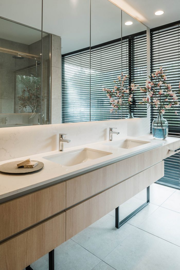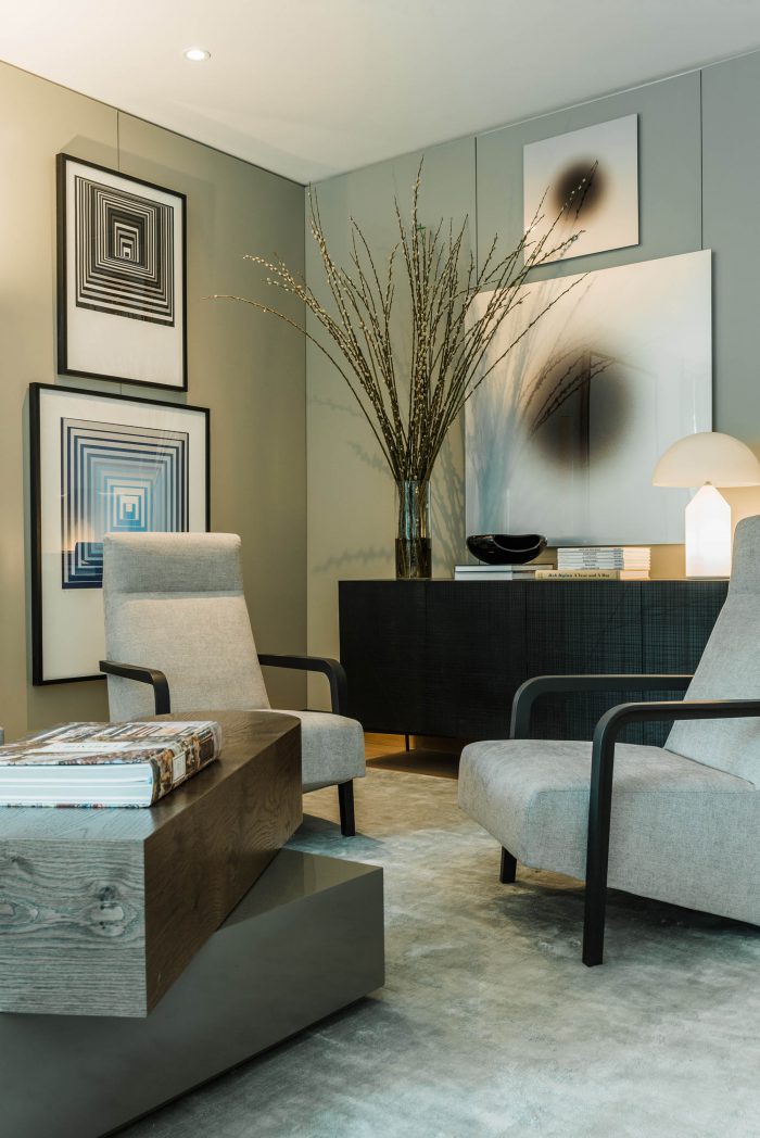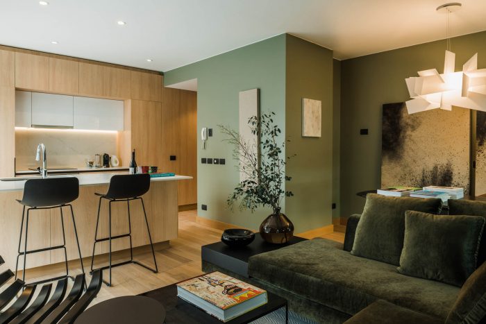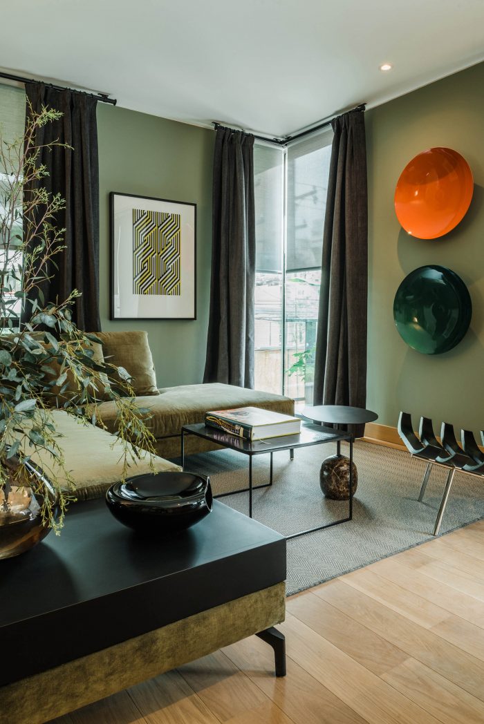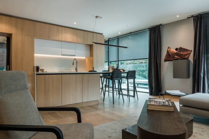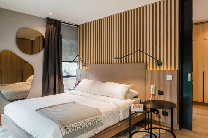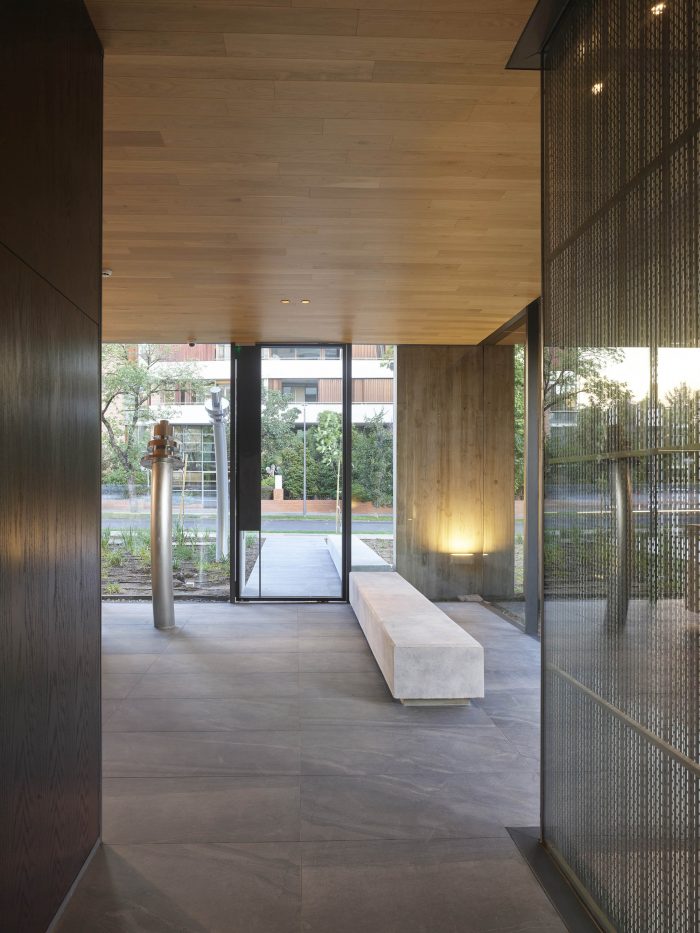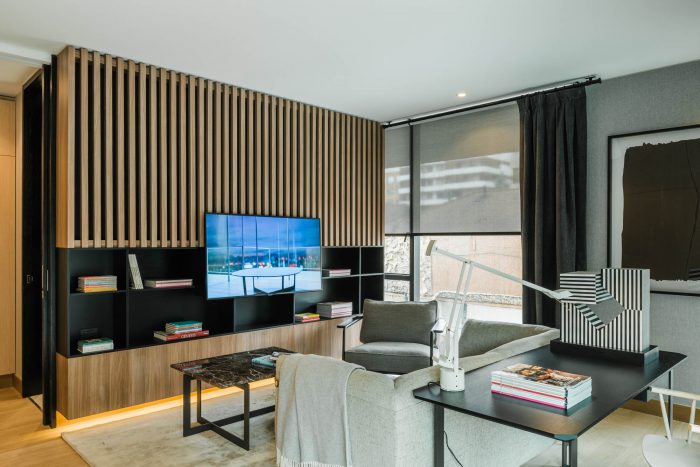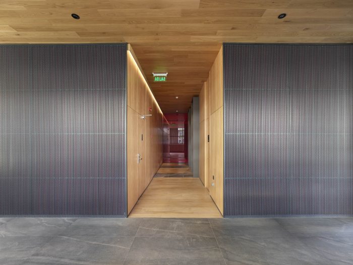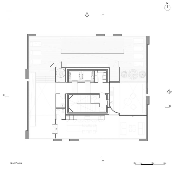 The project frees the first floor for all common use, except the reception, transparent and spacious, surrounded by a garden with sculptures as a pause in the transition from the street to the building. There is no visitor parking, or security gates, but an open green area that gives a different width to the immediate public space. Then a drop-off type car crossing is incorporated as a maneuvering area that complements the access and egress of cars to the building without depending on public roads. The building is developed in an equivalent way towards its four orientations, in order to avoid the scheme of a “front and a back”, allowing to incorporate other views to the units. The structural scheme consists of a system of perimeter columns and a central core. These 144cm x 30cm exposed concrete columns move 72cm along the edge of the slabs in opposing directions. This breaks the vertical serialization of the house in height, with the purpose of increasing the views on the upper floors.