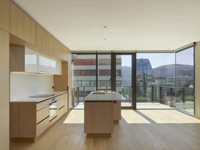 The Riesco Leguía building is a real estate project that is located on the corner between Presidente Riesco street and Augusto Leguía Norte street in an area of Santiago with renovated offices and residential buildings. There are 36 apartment units of 75, 110, and 115m2 spread over 12 floors. In addition, an access floor, the top floor, common with a pool and barbecue area, and three basements. The decisions we make for the project are divided into two opposite exercises, one centripetal and the other centrifugal. The centripetal allows us to understand those elements of the neighborhood and environment that intervene in the definitions of the project and the centrifugal, which are the experiences of the user through the project.
