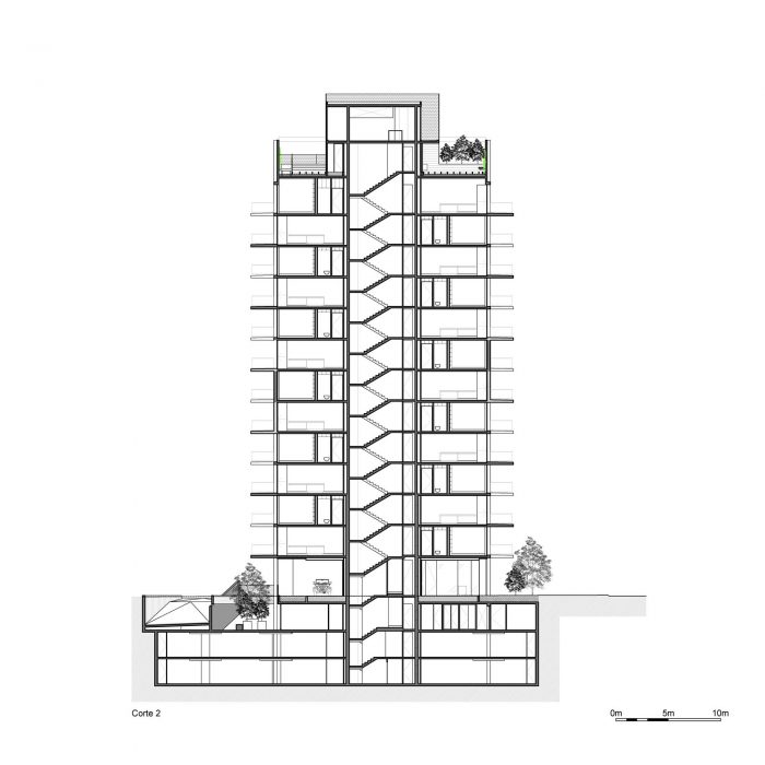 Then, the floors are inverted floor by the middle, seeking to capture as much as possible the metropolitan environment of the neighborhood, through 3 types of apartments in 4 orientations and 12 different heights, which opens up the possibilities of responding better to the user. The 1 and 2-bedroom apartments are 270cm high, with floor-to-ceiling windows with high thermal performance. Each unit with a balcony that projects 2.5m. The composite climate system based on heat pumps that feed a cold/hot radiative floor, plus a continuous ventilation system, complement the proposal in thermal comfort and low operational cost.