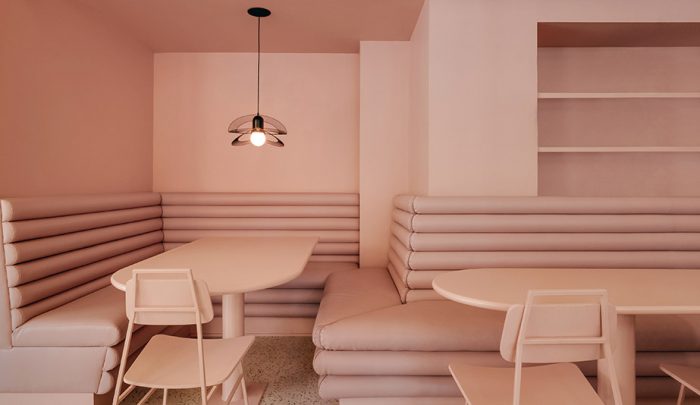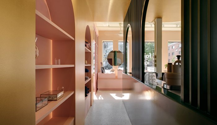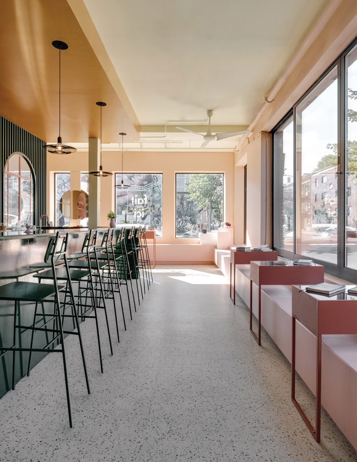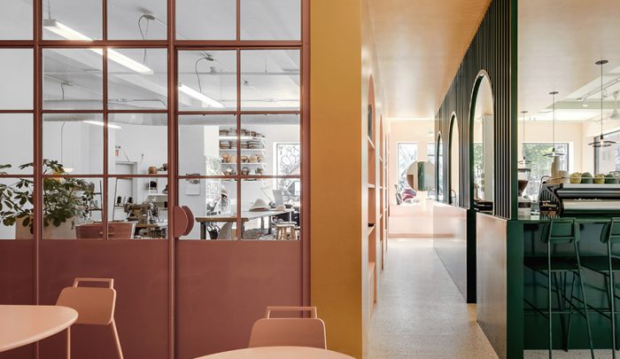 Drenched in sunlight thanks to two walls of street-facing windows, Montreal’s Pastel Rita, a hybrid artisanal workshop-boutique-coffee shop designed by local firm Appareil Architecture, reflects the creative energy of the Mile End neighbourhood. The large windows allow passers-by a peek within, where rich jewel tones and unique architectural detailing draw them inside for a closer look.
