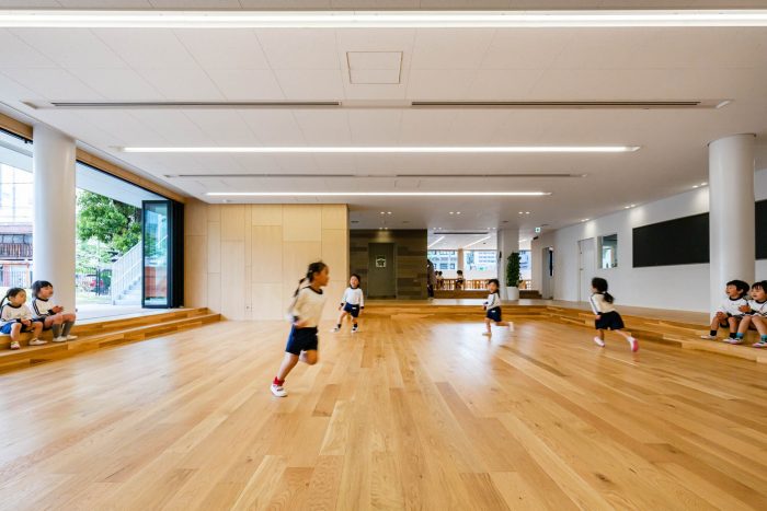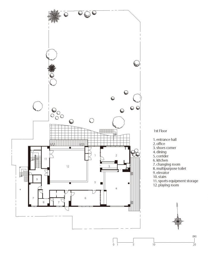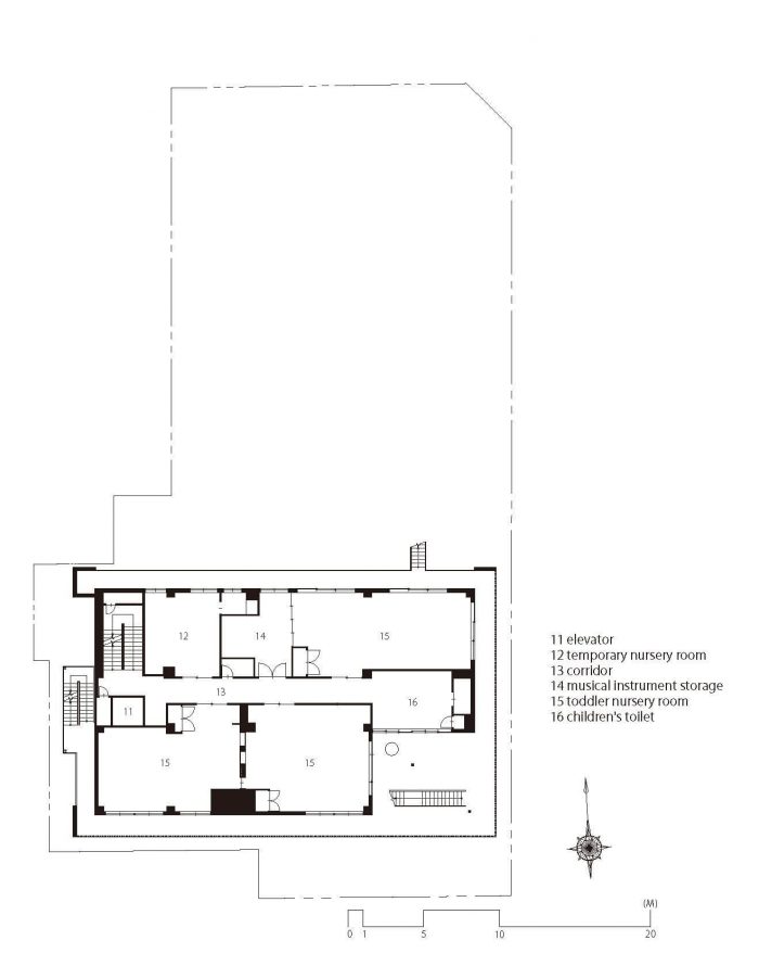 The copper powder is used as finishing material and signs to install a Japanese traditional style and the essence of the temple. Such an ageable material makes children wonder and stimulates their curiosity. Also, the vertical louver makes chances for children to feel the change of nature like rain, sunlight, shadow, and wind, which develops their rich mindset. In these ways, this nursery is the learning place for them to develop their rich mindset while enjoying the change of the seasons and times.