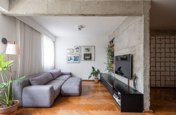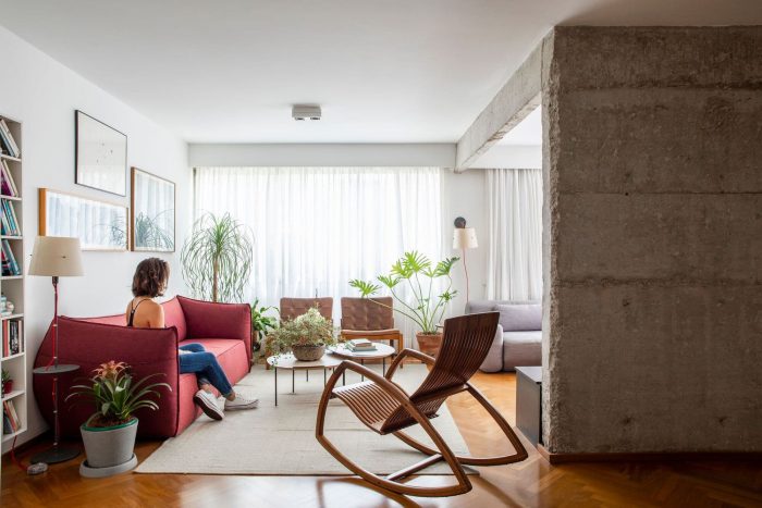 When analyzing the apartment, we saw that the dining room was very dark, in the center of the apartment, with little natural light. And, when researching the infrastructure, we saw that a rather wide pillar between the living and dining area prevented more generous lighting from being easily achieved. We decided to peel and expose this pillar, and open up the wall there as much as possible.