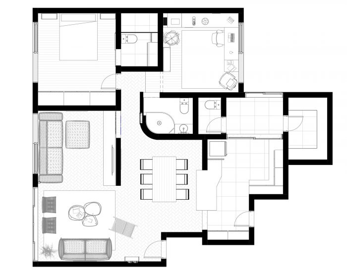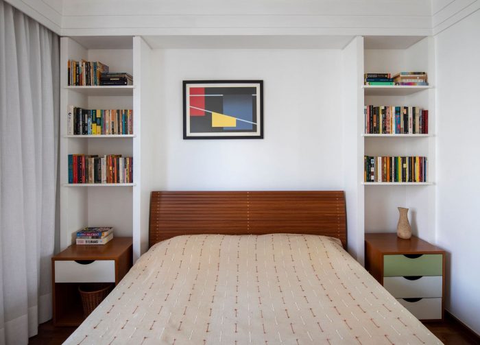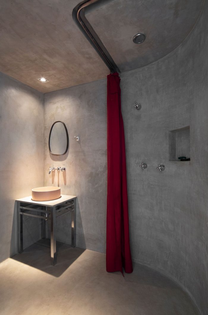 A small civil intervention changed the whole environment: the light gap between the pillar and the wall of the suite was only 90 cm wide, but we changed the bathroom on the opposite side of the corridor, creating a curved wall in front of this new opening, which allows natural light in the middle of the apartment now.