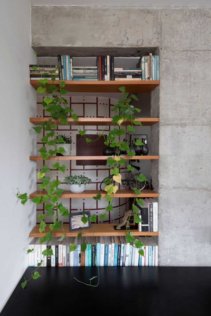 一个小的民事干预改变了整个环境:柱子和套房的墙壁之间的光线差距只有90厘米宽,但我们改变了走廊对面的浴室,在这个新的开口前创造了一个弯曲的墙壁,这使得自然光现在可以在公寓的中间。
