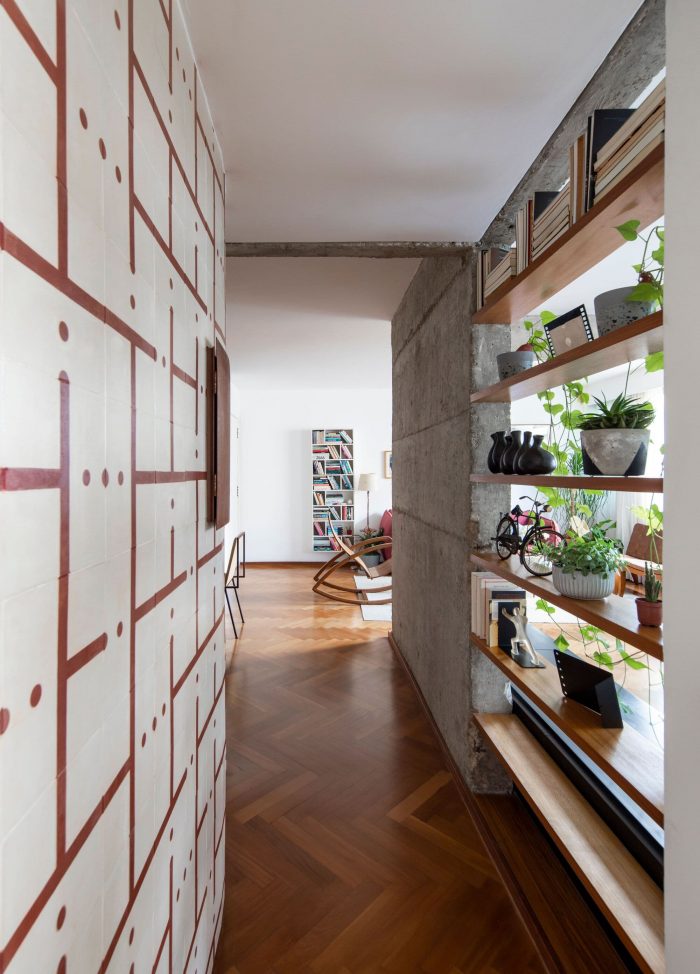 We found it interesting to treat this new curved element in the apartment in an autonomous way, covering it with a hydraulic tile panel designed by Fabio Flaks.