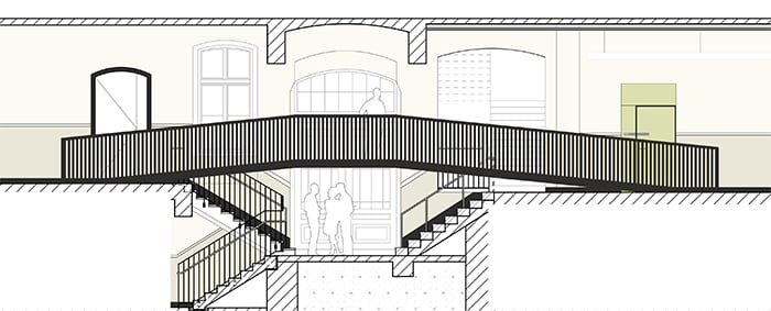 The floor plan structure of the old building was optimized. The mezzanine floor required special attention to create barrier-free access. Already in the early design stage, a bridge was developed that forms a two-meter-high arch over the entrance corridor and thus connects the two mezzanine levels.