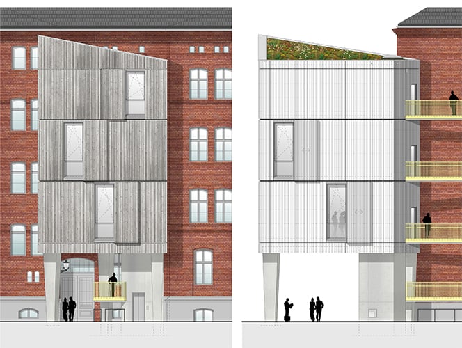 The three-story extension respectful distances itself from the solid masonry building with red clinker bricks. A modern-looking façade made of vertical larch wood slats was deliberately chosen to contrast with the historic brick building. In addition to the expressive cubature, the joints between the floors and the movable sliding elements give the building plasticity. The wooden elements, which can be moved manually, serve as sun protection.