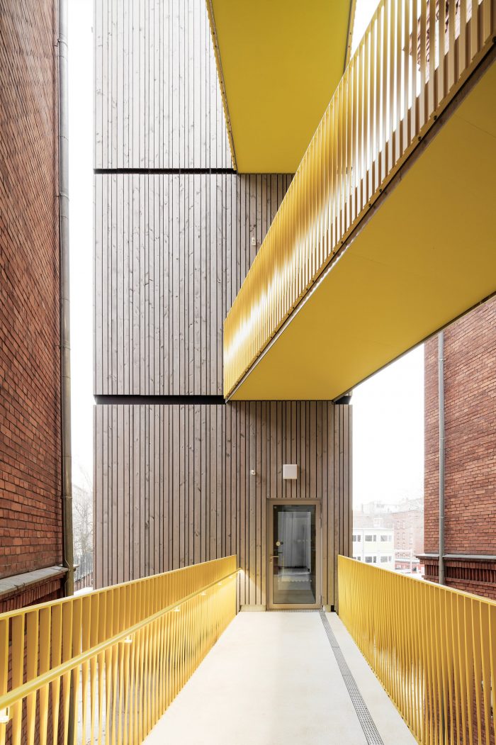 明亮的黄色和艺术性的扭曲的栏杆,现有的建筑通过四座现代桥梁与扩建部分相连。学校的特殊房间,如图书馆,都设在这里。通过整合新的电梯,也可以实现对现有建筑的无障碍通行。