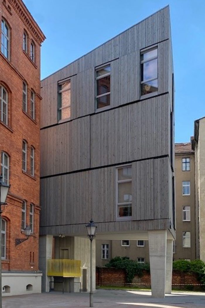 扩建部分的结构被提升到了第一层,细长的锥形柱子使其具有漂浮的效果。通过这种方式,保留了通往老建筑的通道,并尽可能地减少了对现有学校操场的影响。这座由建筑师赫尔曼-布兰肯斯坦(Hermann Blankenstein)于1875年设计的建筑属于 "märkische "砖砌哥特式风格,并带有装饰性元素。