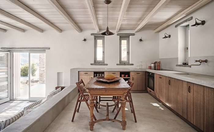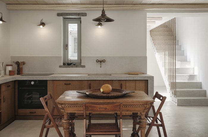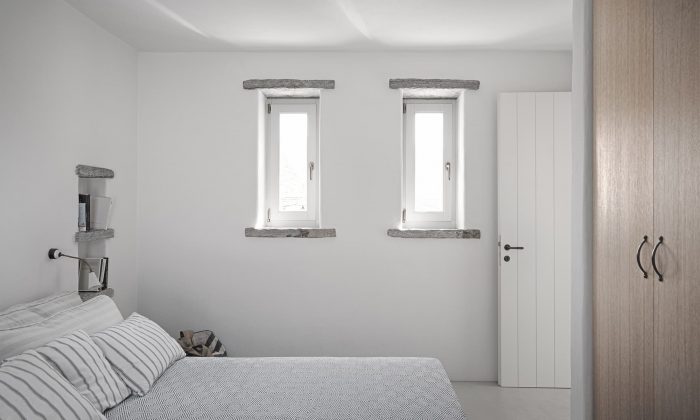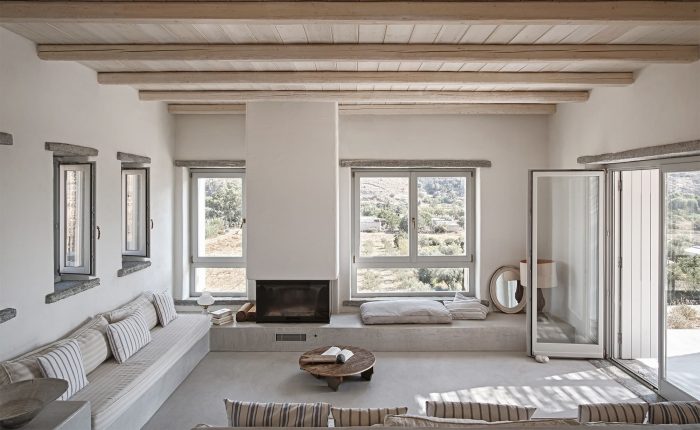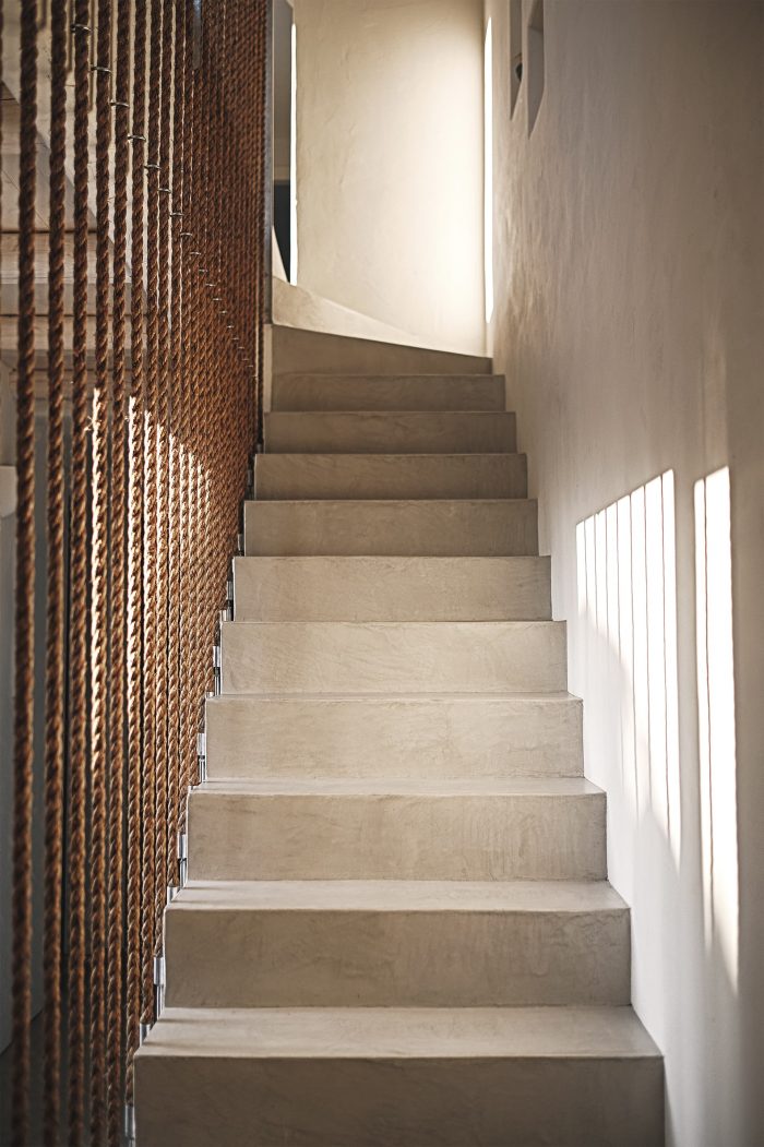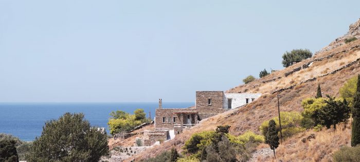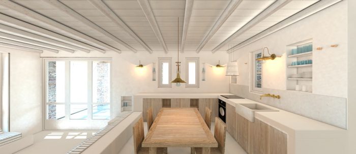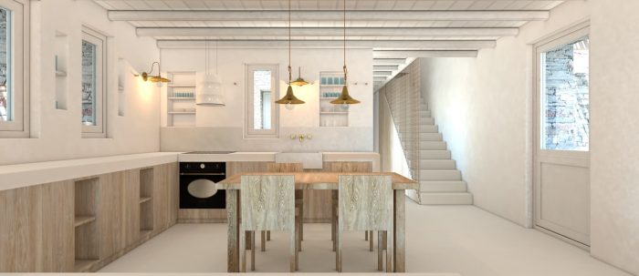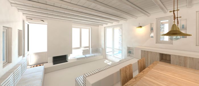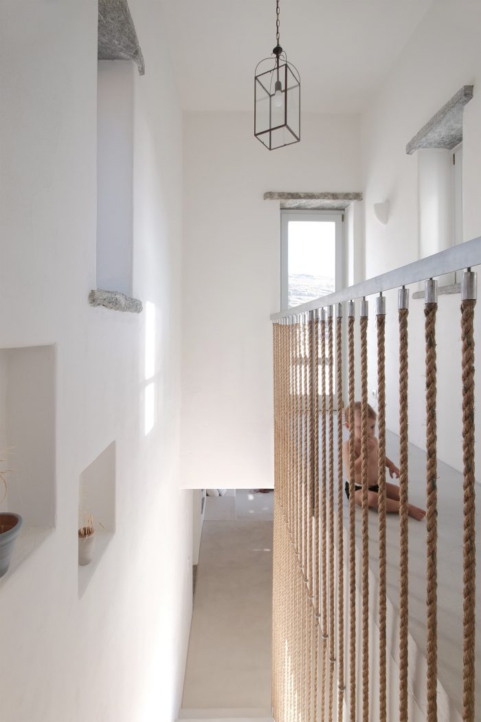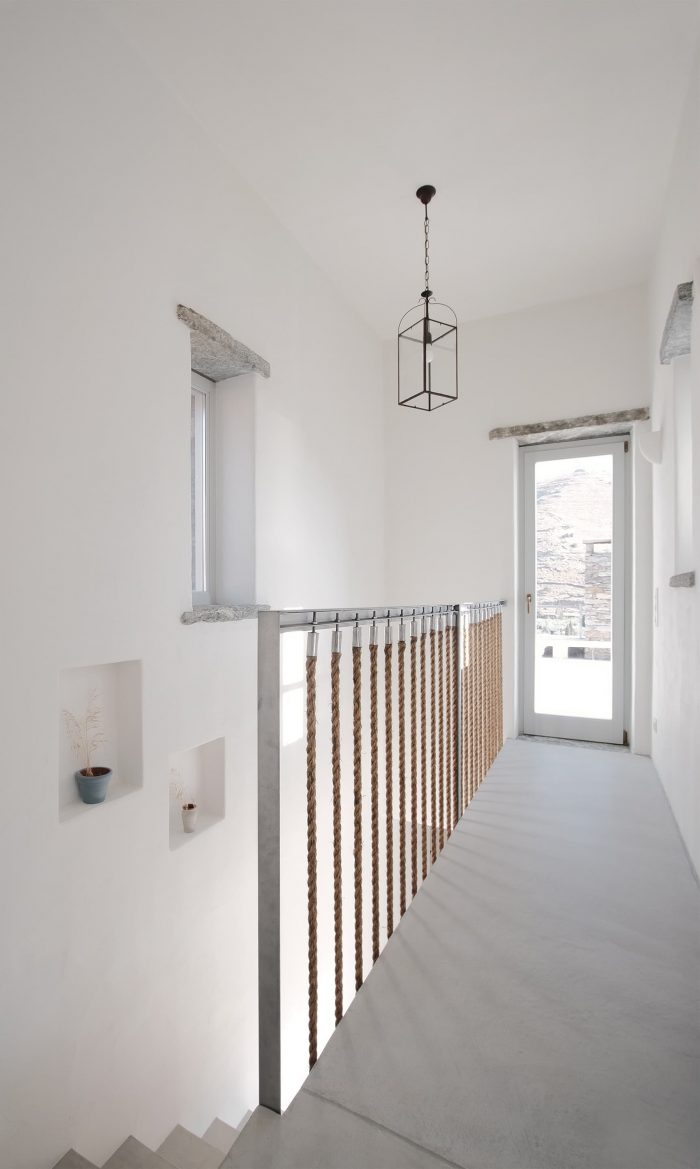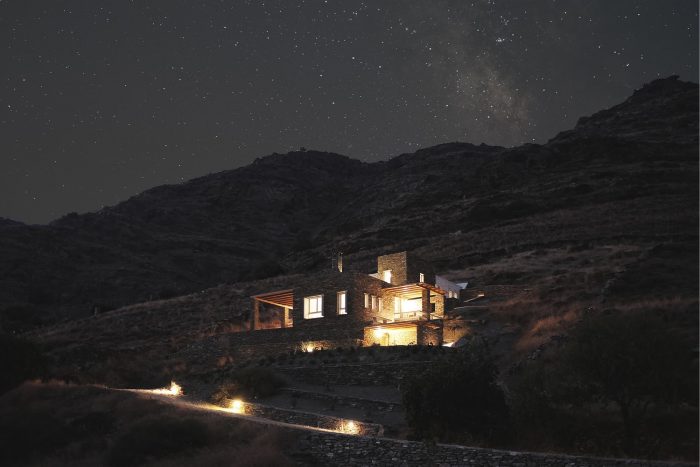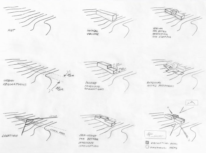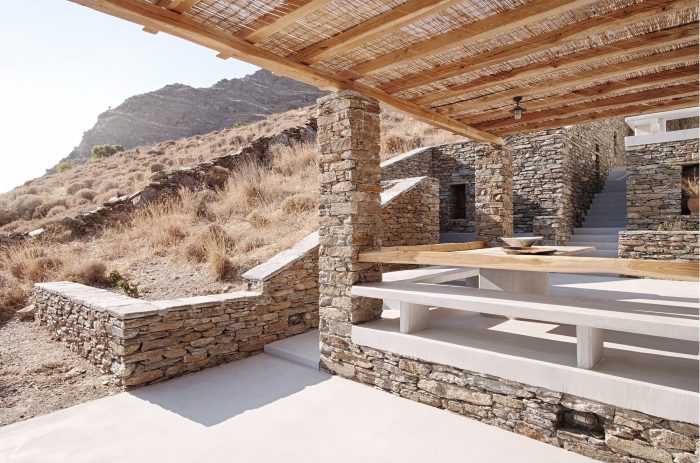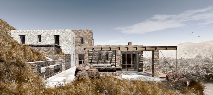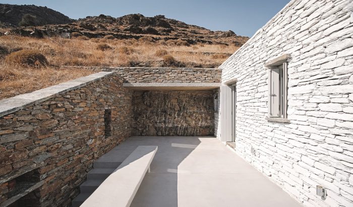 The experience of the Cycladic landscape is the design’s main concern expressed through the spatial evolution and relationship of the building with the dramatic land. This is achieved through the traditional method of construction called “kotounto”, a dry, humid-free space between the rock and the building. In such a way, the external spaces, a continuous perimetrical ‘kotoundo’ makes the building sometimes trying to break away from the rock and sometimes to reconcile with it.