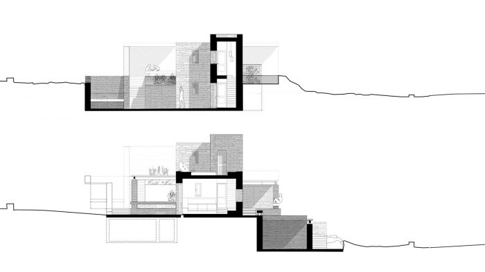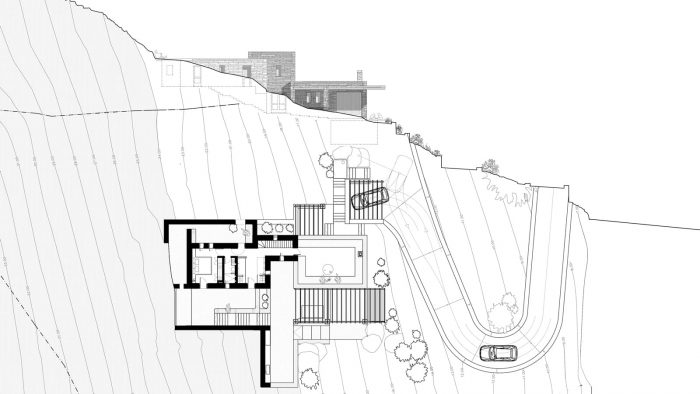 The steep ground and the plot’s narrow dimensions determine the pronounced and gradient form of the building which rises from the mountain and over the valley of Poisses, to finally balance itself with the surrounding traditional dwellings and the natural context.