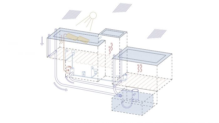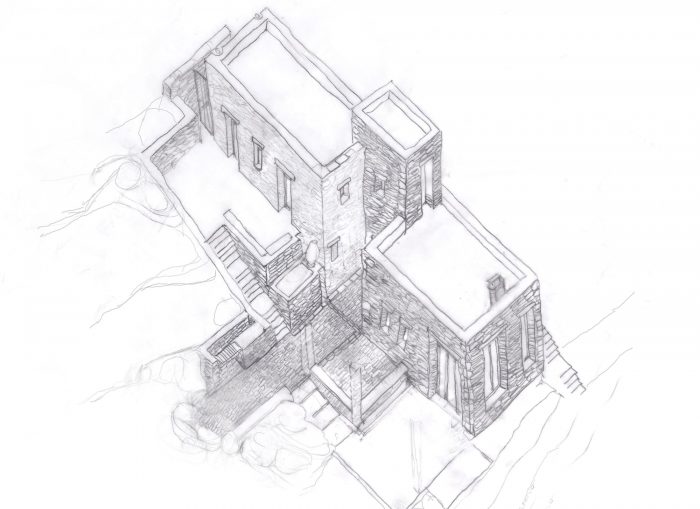Apart from this traditional tecnique of which is principlally used to drain the waters coming from the mountains, leaving walls and foundations dry, the house includes in its design an under-floor heating installation which is generated by the solar heaters installed in the roof. The cooling is achieved from cross ventilation and also an additional under-floor cooling is provided. Finally, the rainwater is collected in the 3 rooftops and stored in an underground reservoir.