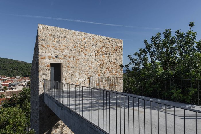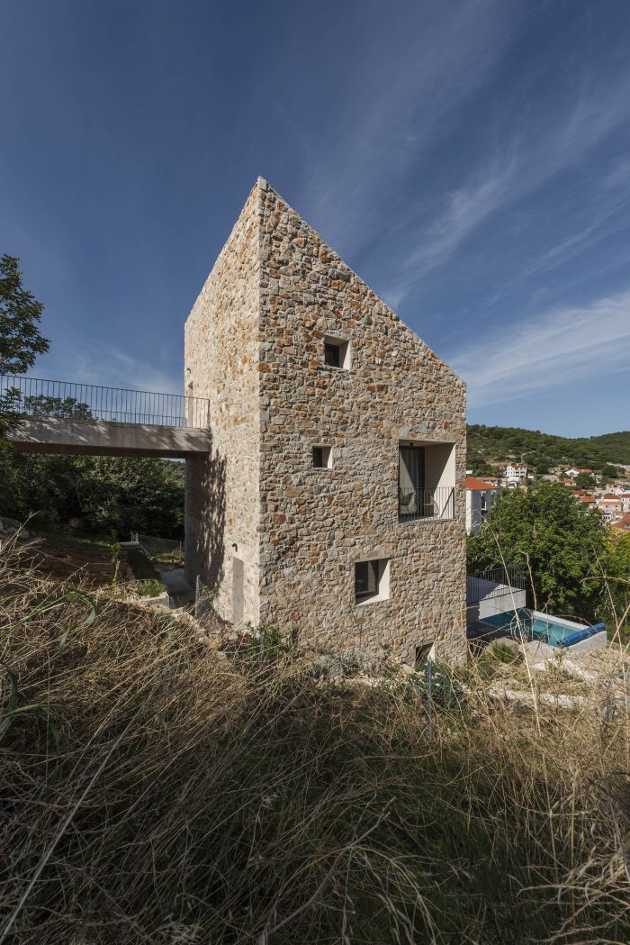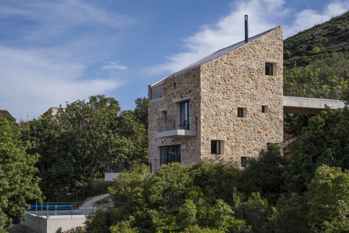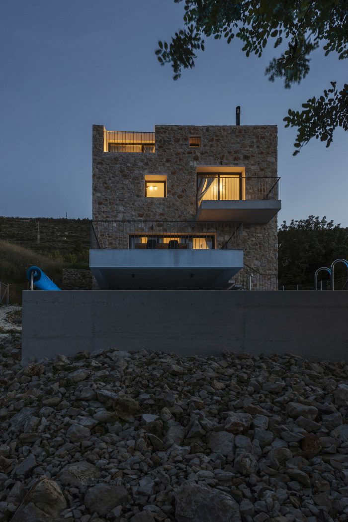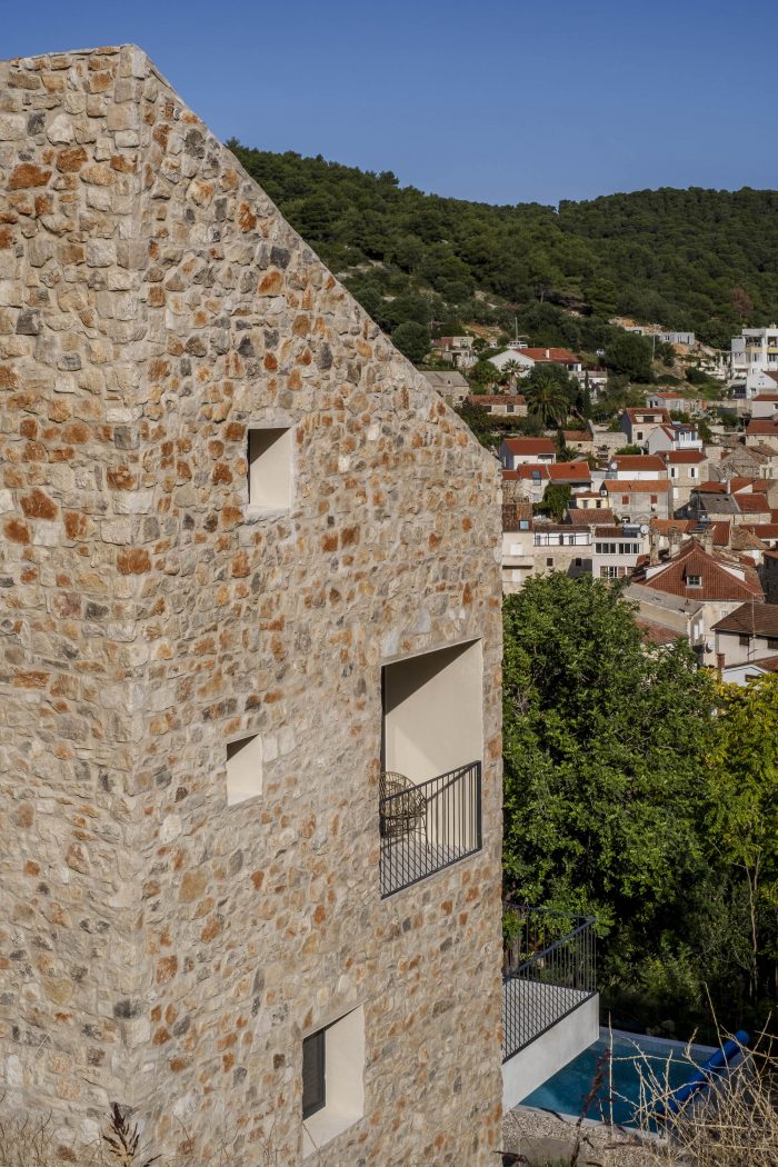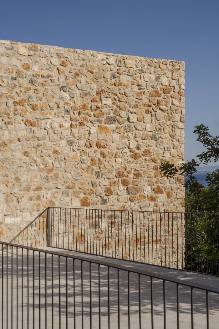 The authentic Vis stone is used for the construction of the house. The stone is in synergy with the honed concrete blocks and surfaces which make up the console terraces, the balcony, the bridge to the entrance of the house, the paths, the loggia, and the roof. The surfaces have been conceived to protrude out of the stone structure of the house as if they were cut off bridges. The chosen materiality of the house preserves the memory of the local tradition, bringing together a symbiosis of the archaic (stone) and the contemporary (concrete). The house as a fragment honors the formal and the constructive relationships with the historical center of the town.