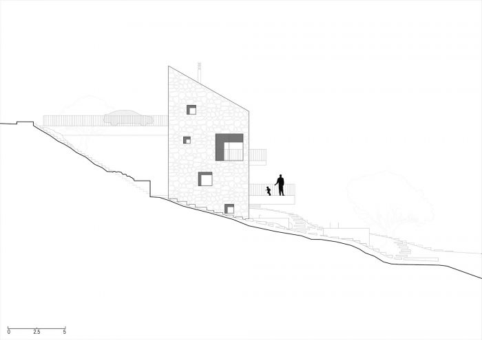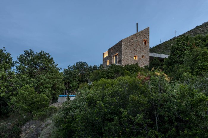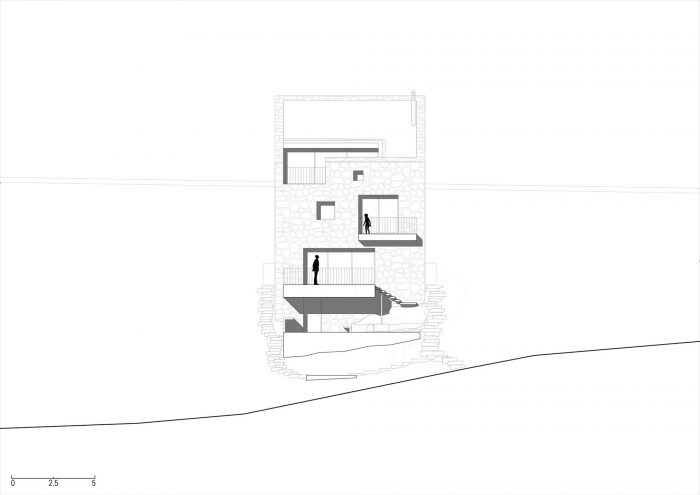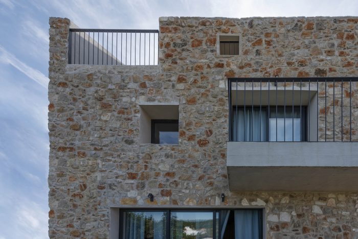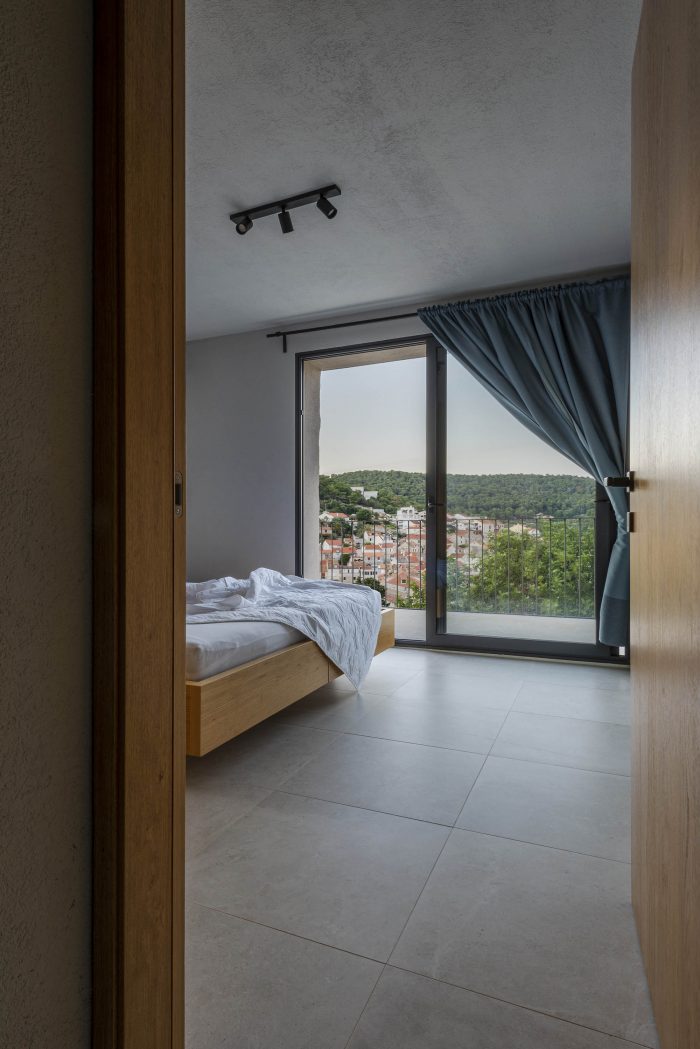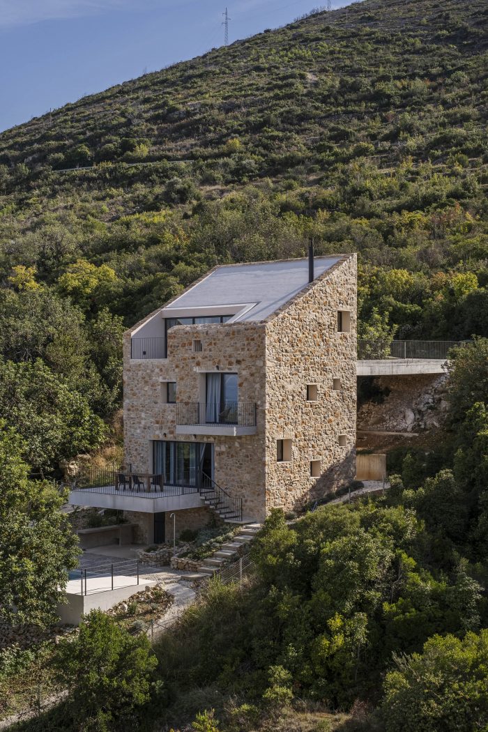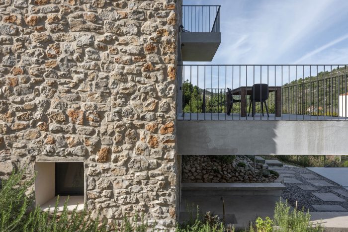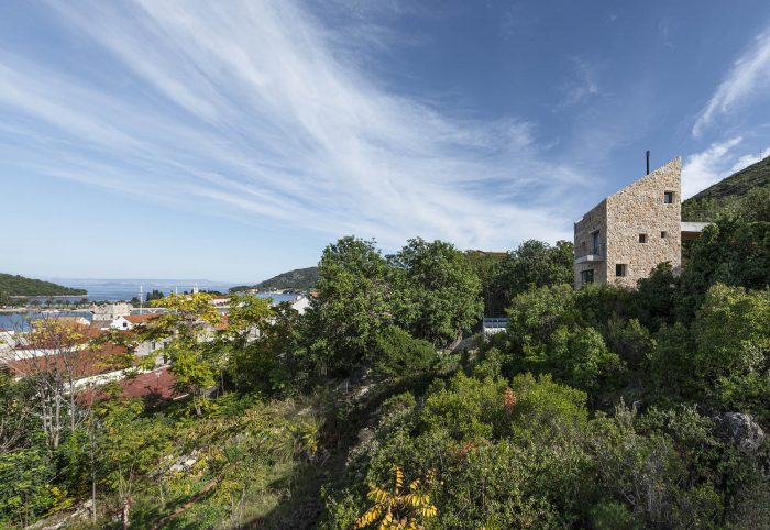 The authentic Vis stone is used for the construction of the house. The stone is in synergy with the honed concrete blocks and surfaces which make up the console terraces, the balcony, the bridge to the entrance of the house, the paths, the loggia, and the roof. The surfaces have been conceived to protrude out of the stone structure of the house as if they were cut off bridges. The chosen materiality of the house preserves the memory of the local tradition, bringing together a symbiosis of the archaic (stone) and the contemporary (concrete). The house as a fragment honors the formal and the constructive relationships with the historical center of the town.